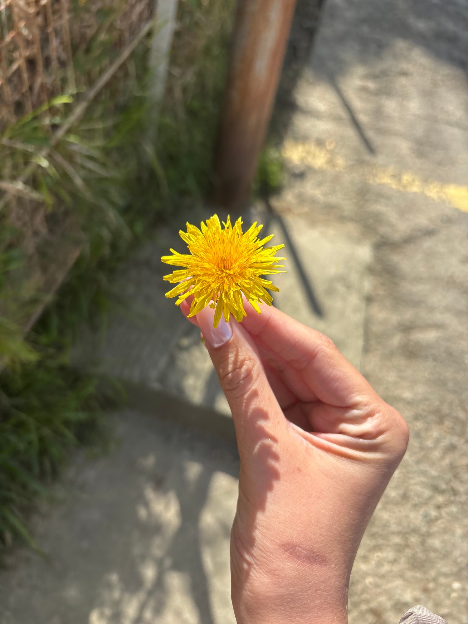 A close-up shot depicts a fair-skinned hand holding a vibrant yellow dandelion flower. The hand is positioned against a background of concrete and green foliage. The thumb and index finger gently gras…read more