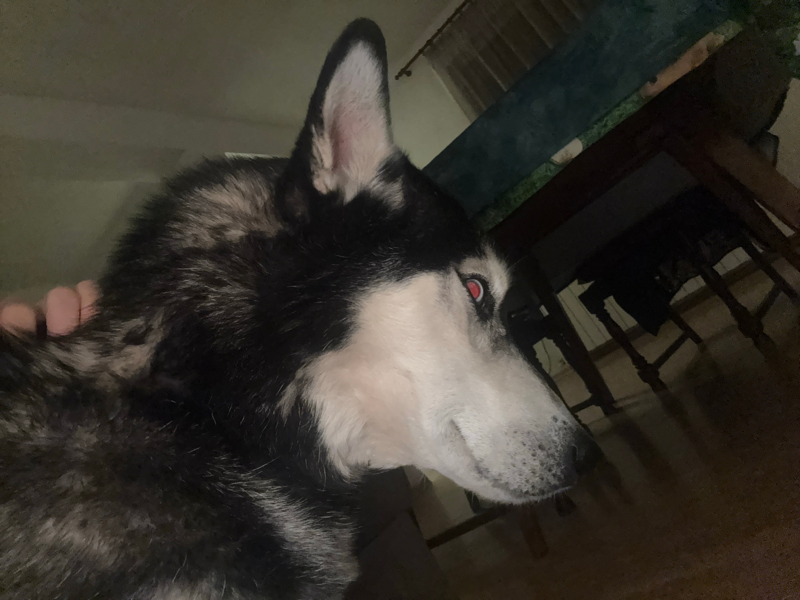 A close-up, indoor shot presents a husky dog in a rotated orientation. The dog is primarily black and white with short fur, with a mostly white face and visible white ear. The dog’s eye appears red. A…read more