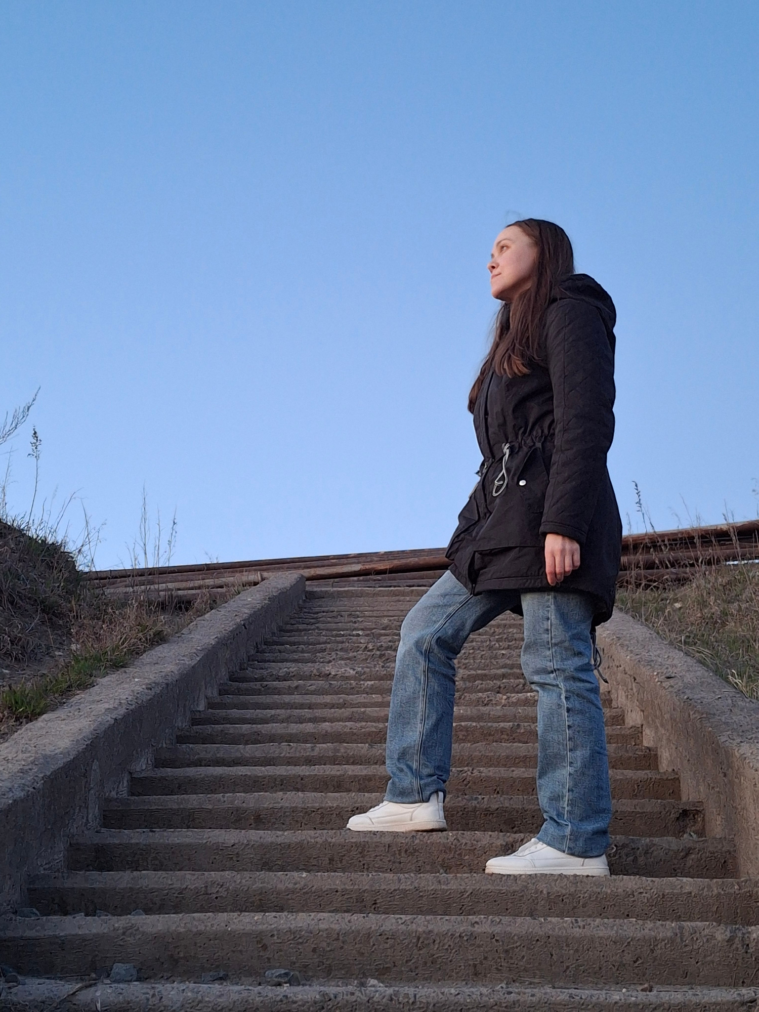 A young woman with long brown hair, wearing a black puffer jacket, blue jeans, and white sneakers, is lying on a flight of concrete stairs. The stairs are weathered and appear to be part of a structur…read more