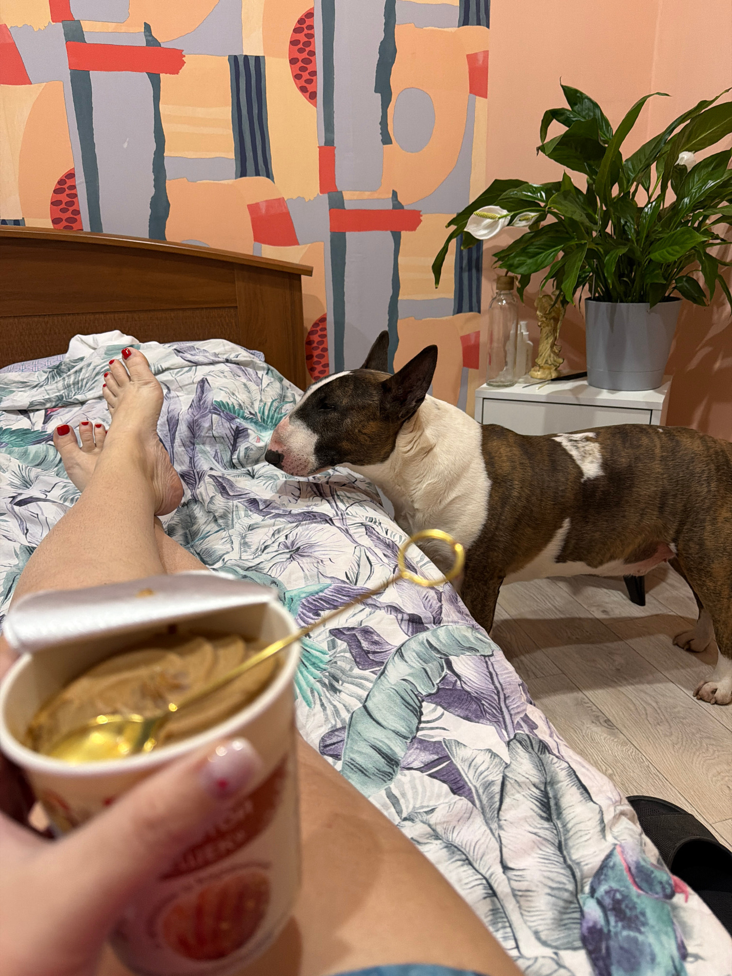 A brindle and white Bull Terrier dog rests its head on a bed covered in a floral print duvet. A woman's bare feet with red painted toenails are visible near the dog. In the foreground, a woman holds a…read more