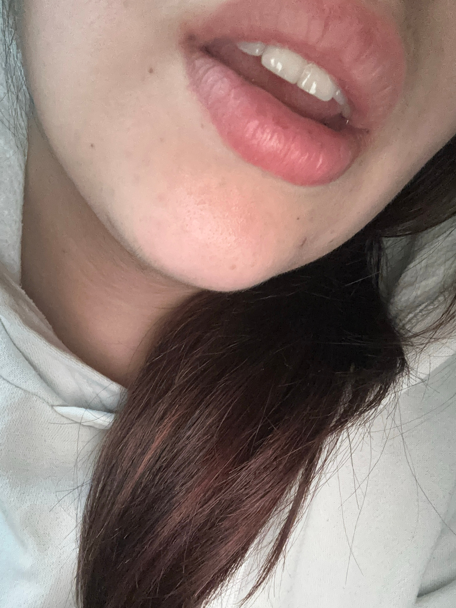 Close-up view of a woman's face and hair. Her mouth is open, showing some teeth. She has brown hair. The background is out of focus, but appears to be light-colored fabric. There is no discernible loc…read more