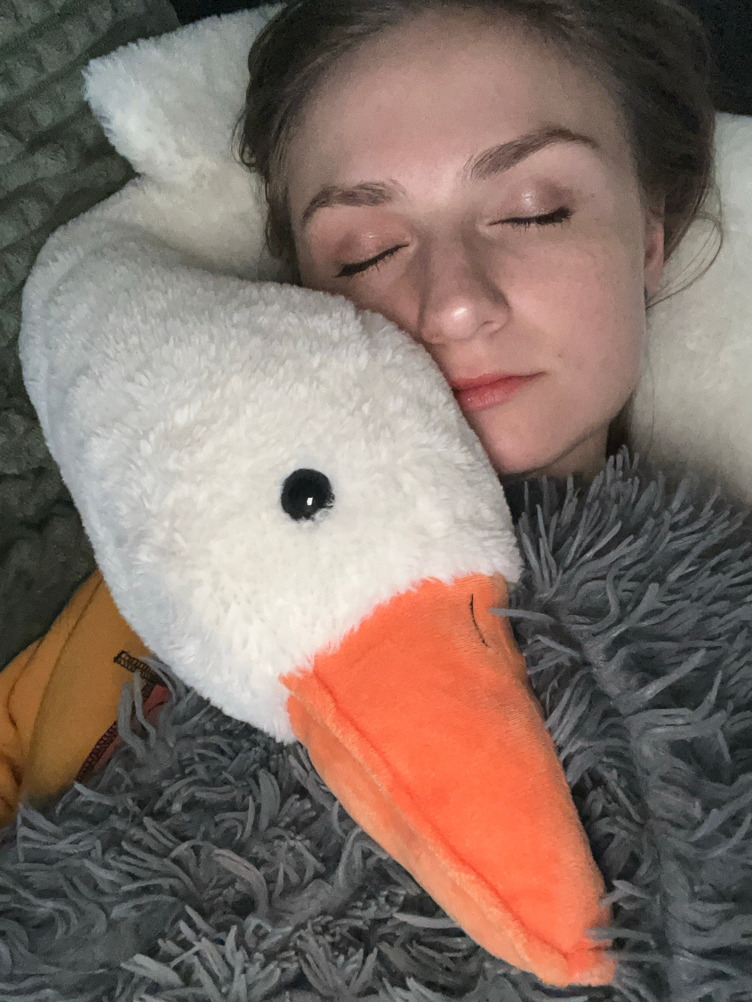 A woman is asleep, resting her head on a white, plush, stuffed goose. The goose has an orange beak and a black eye. The woman is fair-skinned with closed eyes. She is partially covered by a gray, shag…read more