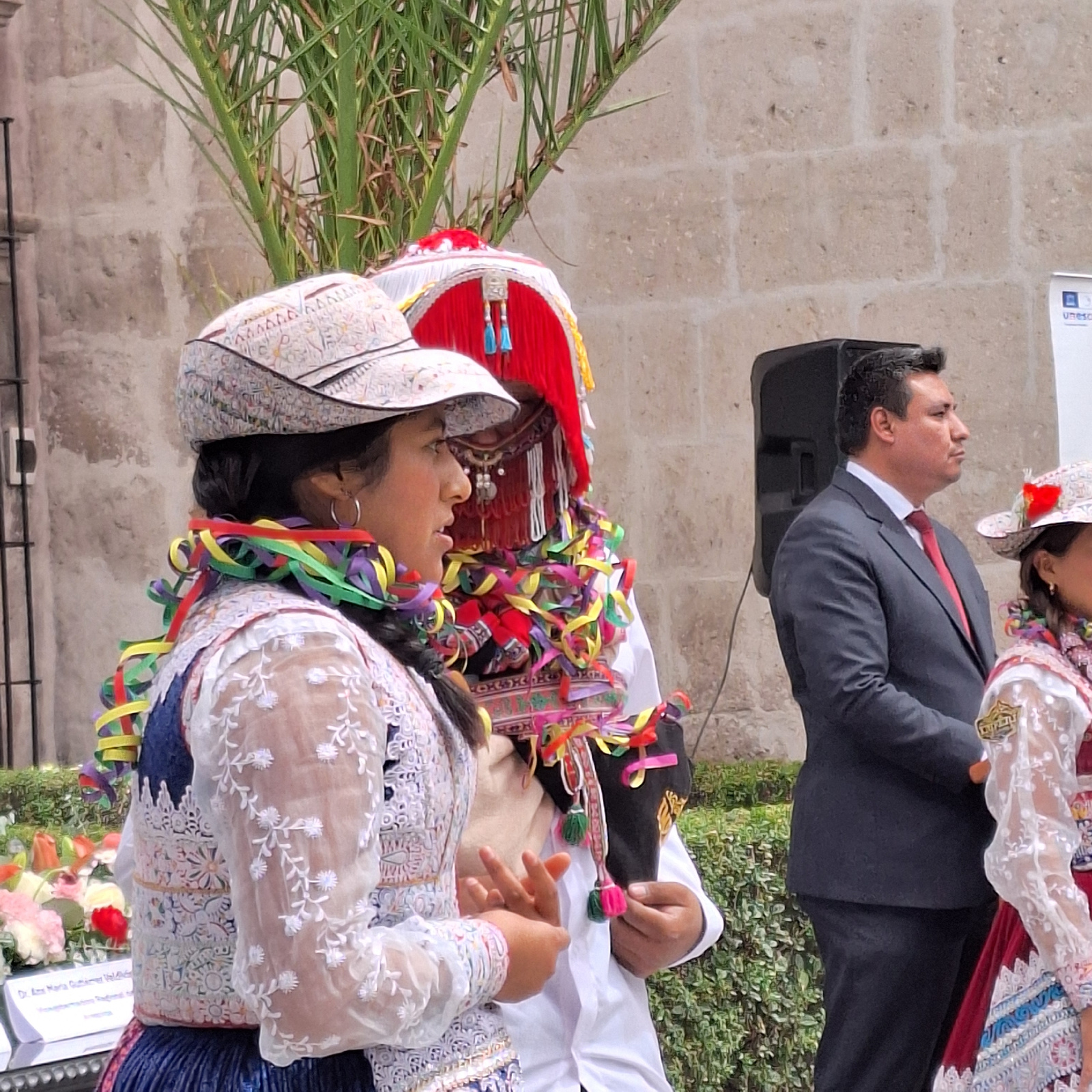 Captured outdoors in Arequipa, Peru, the image shows a couple, seemingly in a cultural or celebratory context. The woman, prominently positioned, is adorned in what appears to be traditional Andean atβ¦read more