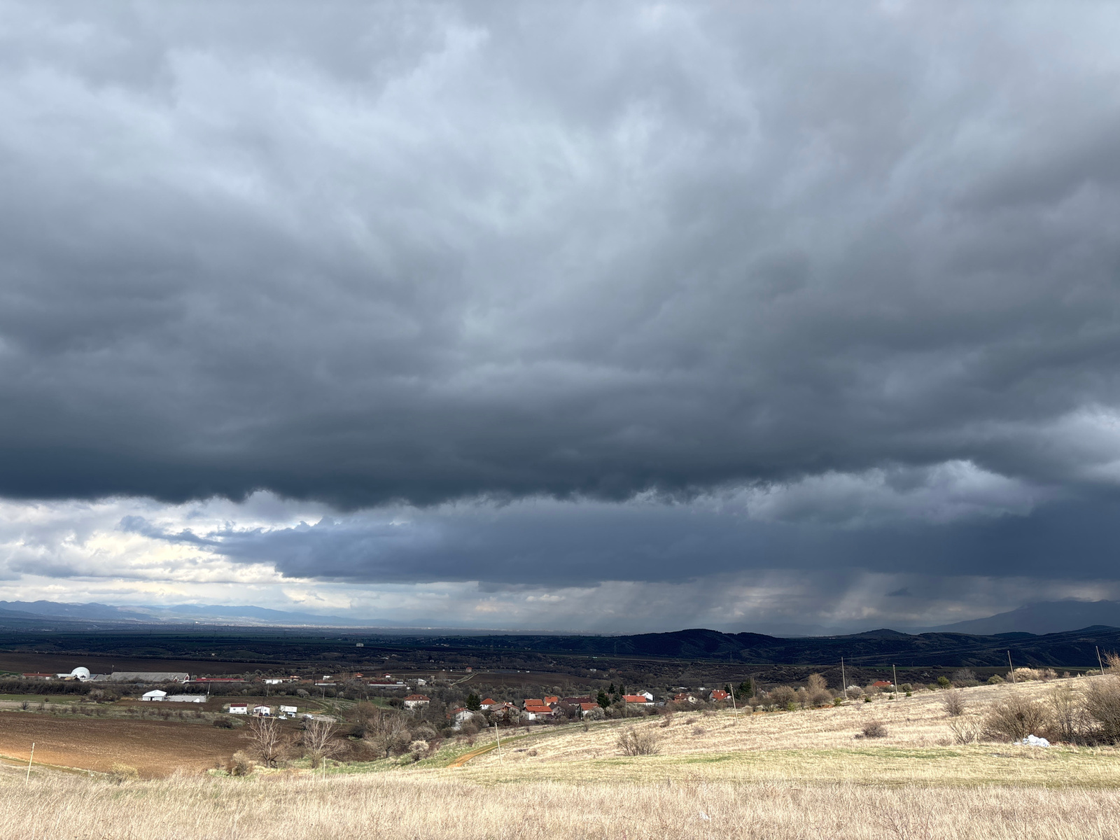 The image depicts a landscape near Hrabarsko, Bulgaria, under a dramatically overcast sky. Dark, heavy storm clouds dominate the upper portion of the frame, with a section of particularly intense dark…read more