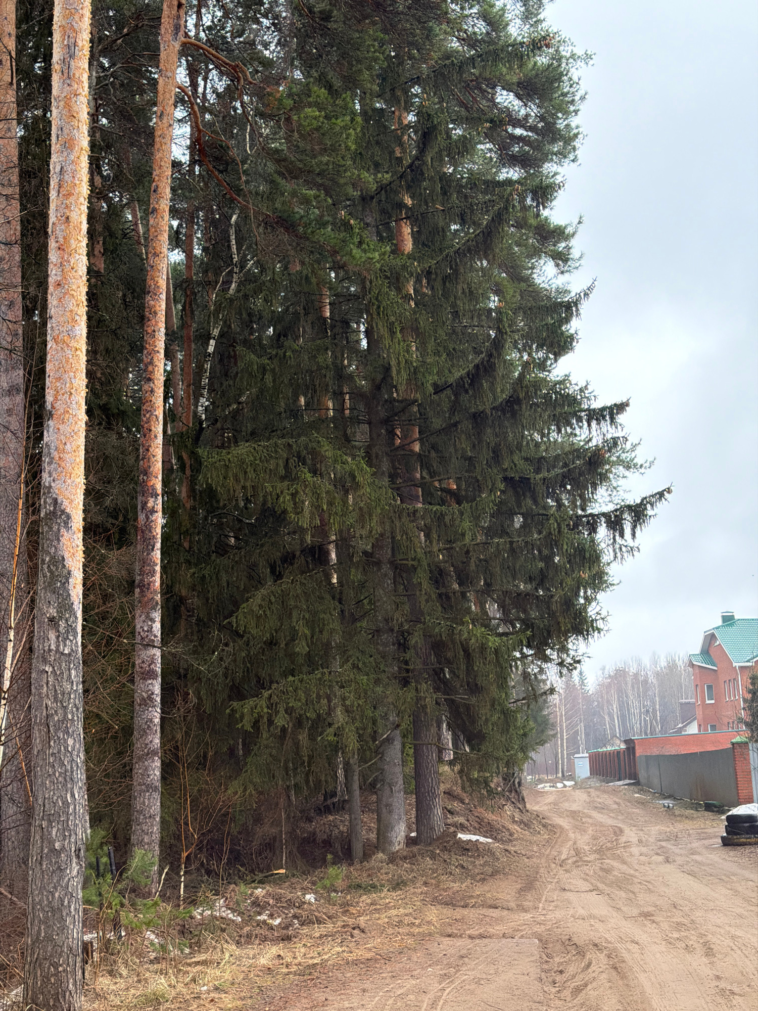 The image shows a forest scene likely near the city of Chaikovsky, Russia. Many tall evergreen trees are visible, with some appearing to be leaning or fallen. A dirt road or path runs along the edge o…read more