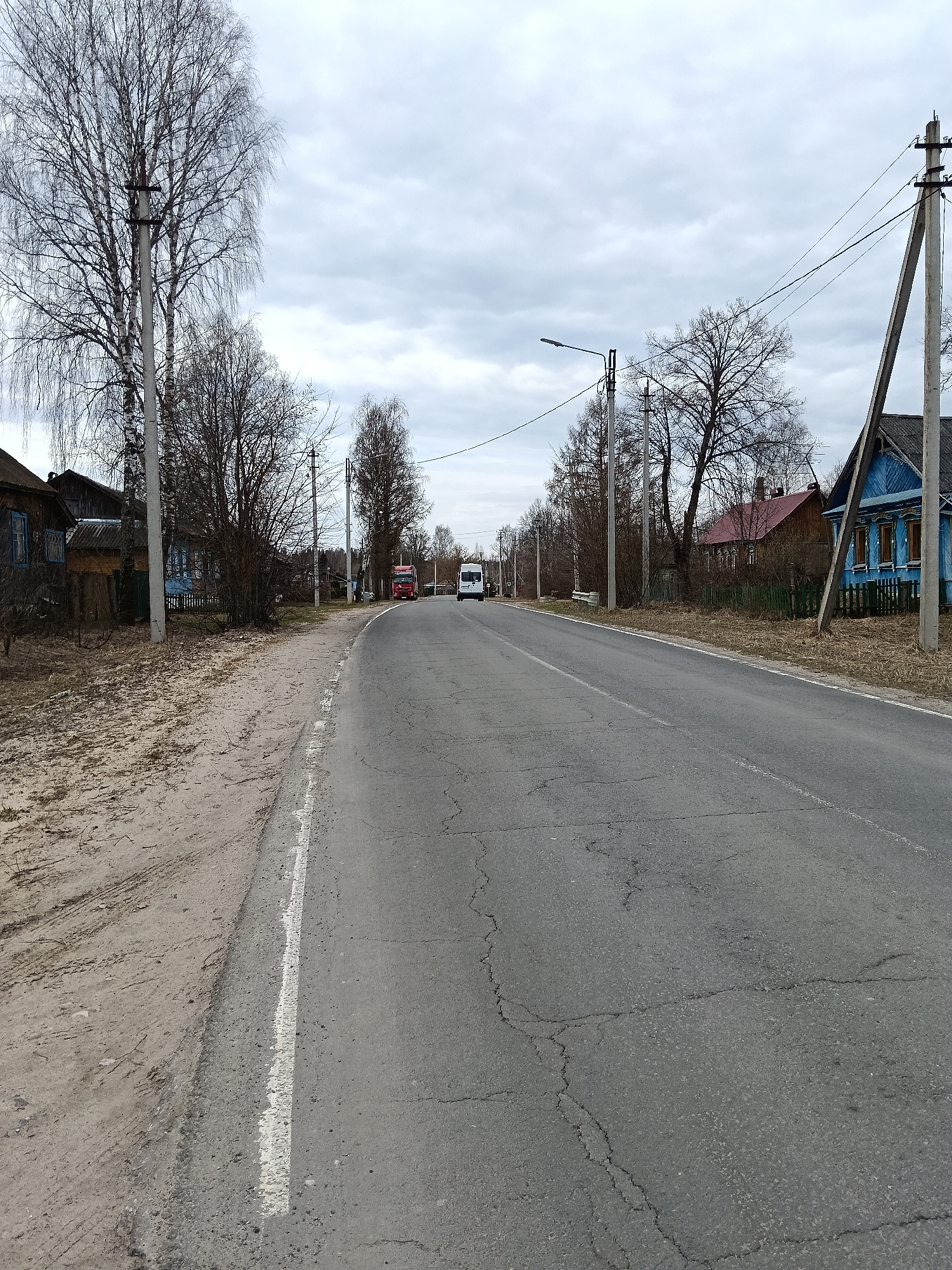 The image shows a straight asphalt road in the village of Красный Маяк, Russia. Cracks mar the road surface. A solid white line marks the road's edge. On either side of the road, bare trees and houses…read more