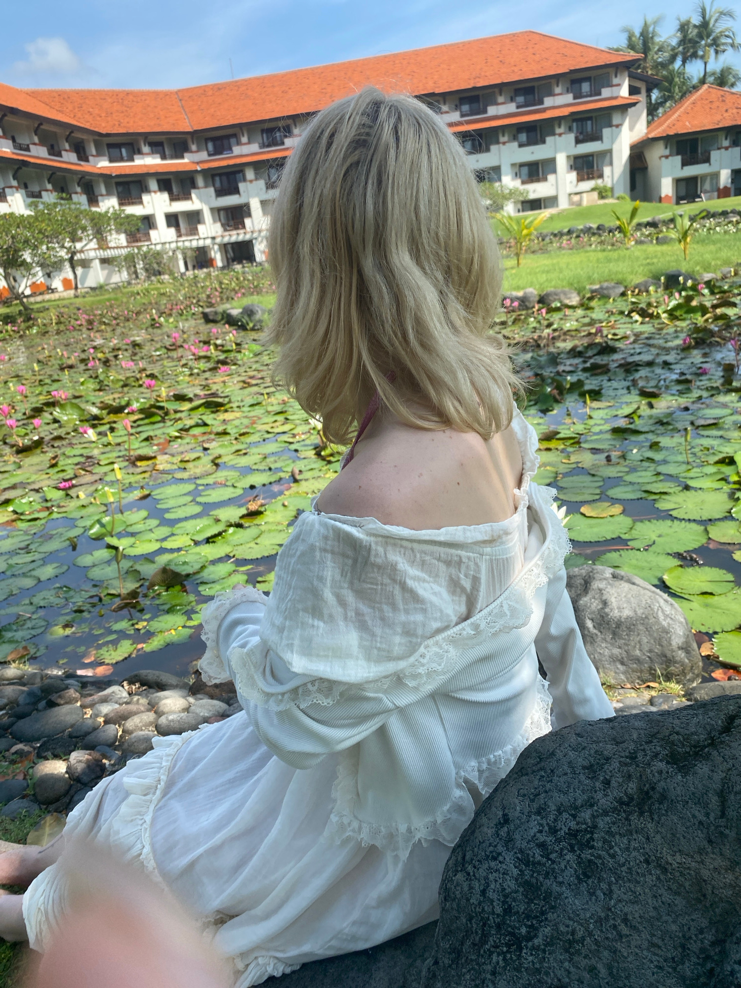 A medium, eye-level shot oriented vertically shows a blonde-haired person wearing a white dress, situated adjacent to a pond covered with lily pads. The person appears to be next to a large dark rock.…read more