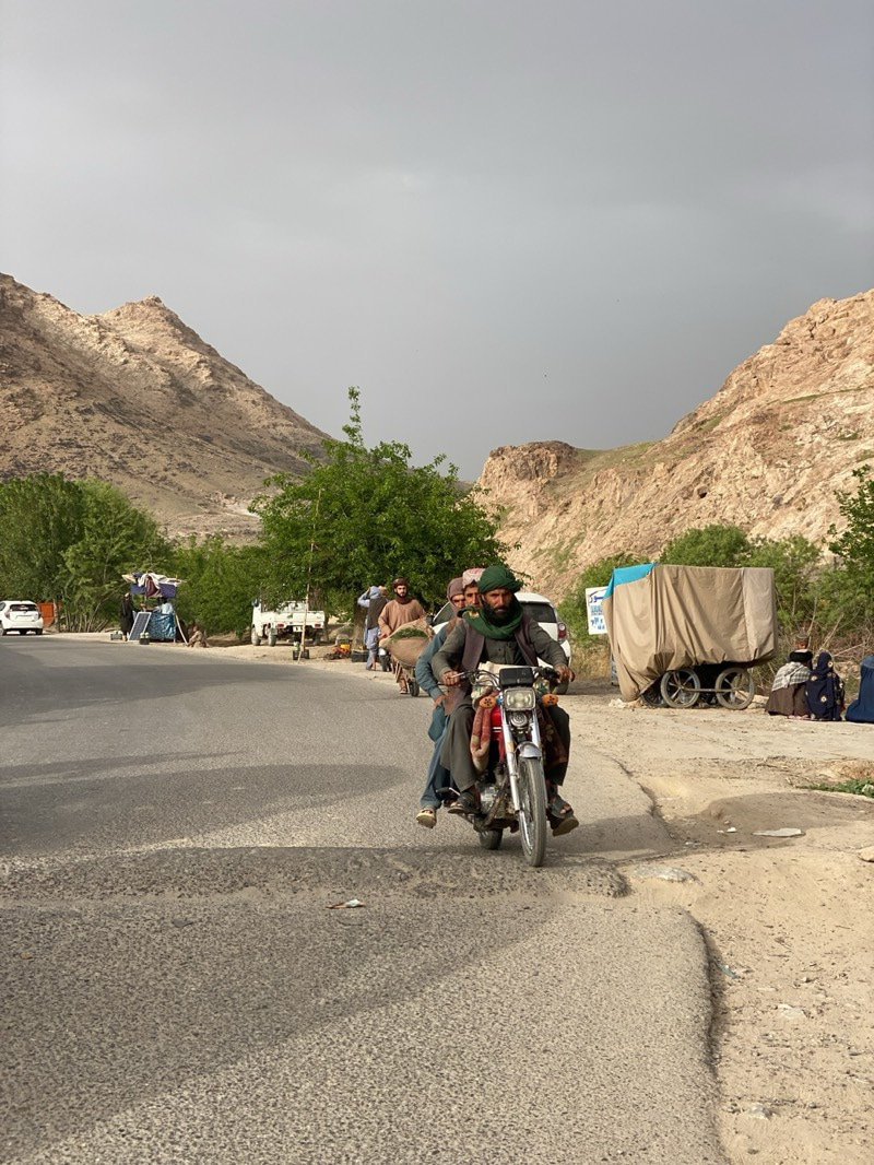 The image depicts a motorcycle with a driver and at least one passenger riding on a road in the city of Khana Gerdab, Afghanistan. The driver has a dark beard and is wearing a dark-colored vest or jac…read more
