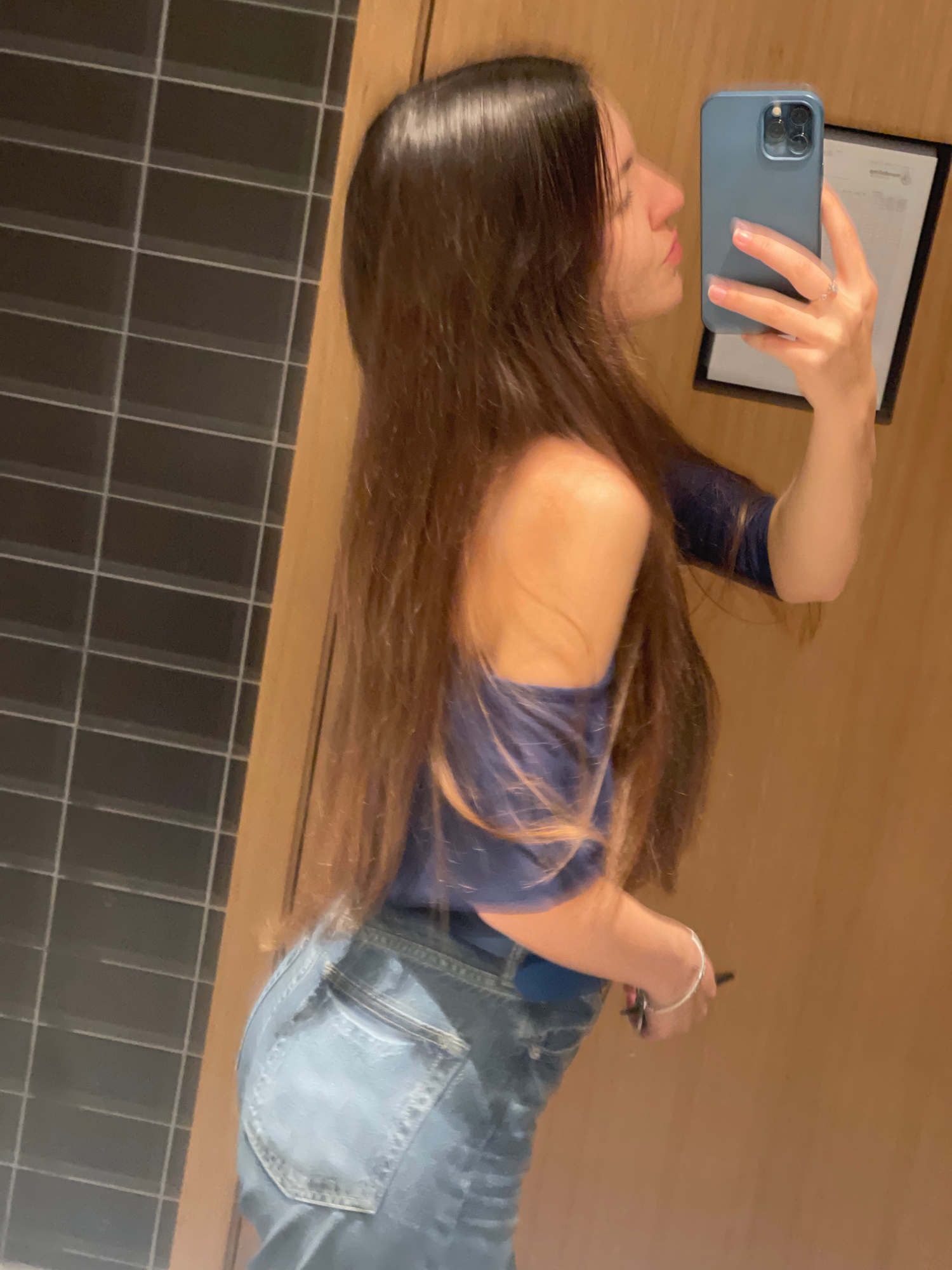 A woman with long brown hair lies on a wooden surface next to a wall covered with black rectangular tiles, likely in the city of Valencia, Spain. She is holding a blue smartphone to take a selfie. She…read more