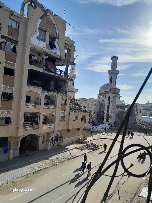 A severely damaged building stands adjacent to a road where several people are walking. The building's structure is compromised, with exposed interiors and missing sections. In the background, a mosqu…read more