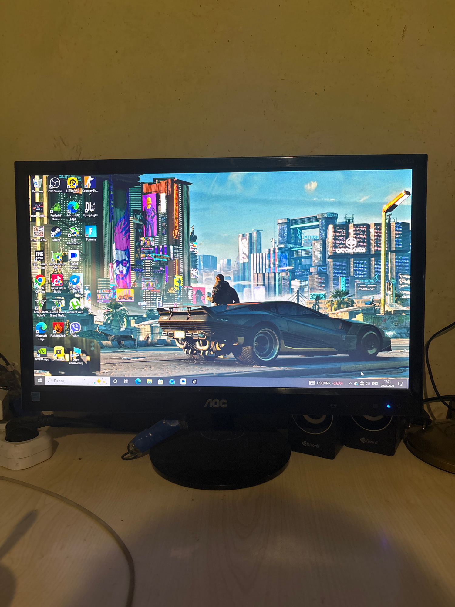 The image shows a computer monitor displaying a wallpaper featuring a futuristic cityscape, likely inspired by the game Cyberpunk 2077. The monitor is an AOC brand and has visible icons on the desktop…read more
