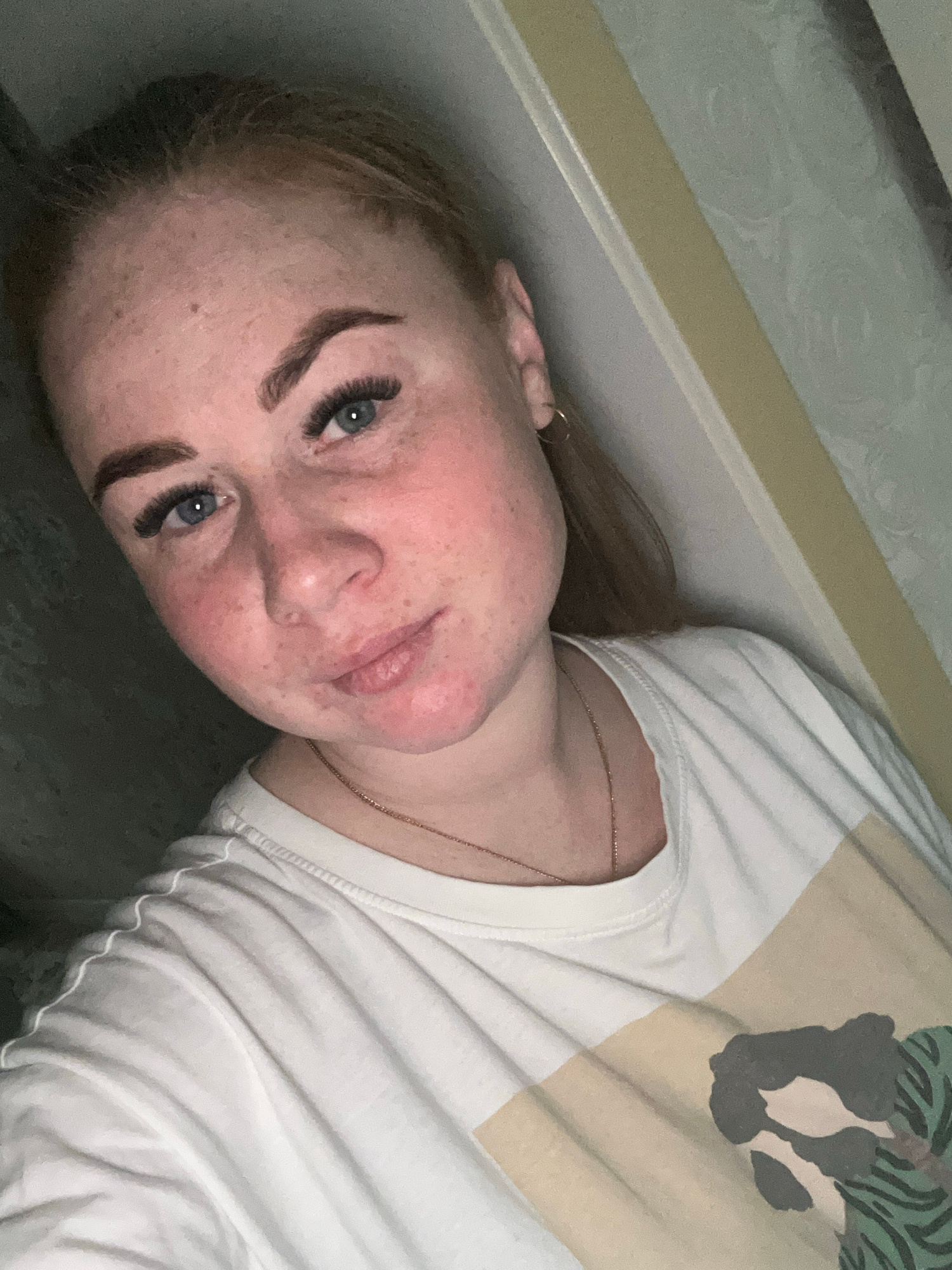 A fair-skinned woman with freckles, wearing a white t-shirt with a printed design, is lying down looking at the camera. She has blonde hair and blue eyes and wears an earring. The background includes…read more