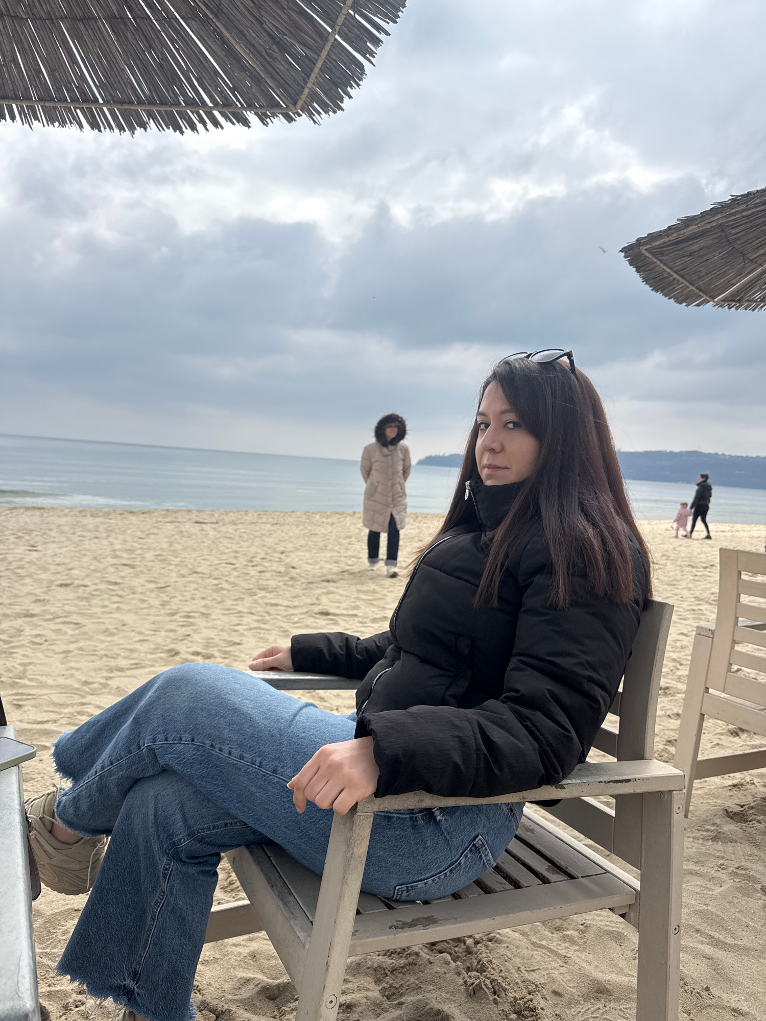 The image depicts a young woman sitting on a wooden chair on a sandy beach. She is wearing a black puffer jacket and blue jeans. Sunglasses are perched on her head. The beach extends to the horizon wi…read more