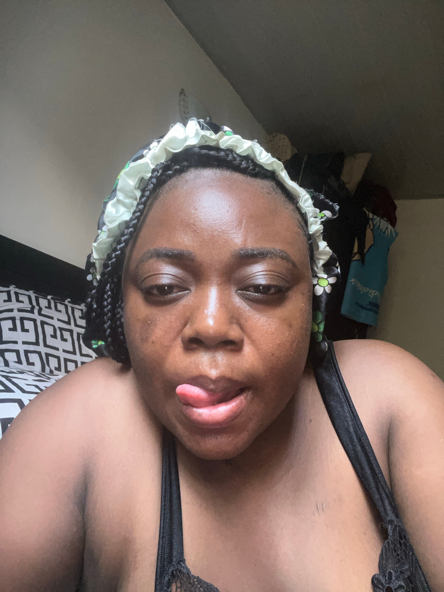 A close-up, rotated selfie captures a person with dark skin, likely female, in a relaxed indoor setting, possibly a bedroom in Abuja, Nigeria. The subject wears a satin-like protective hair bonnet wit…read more