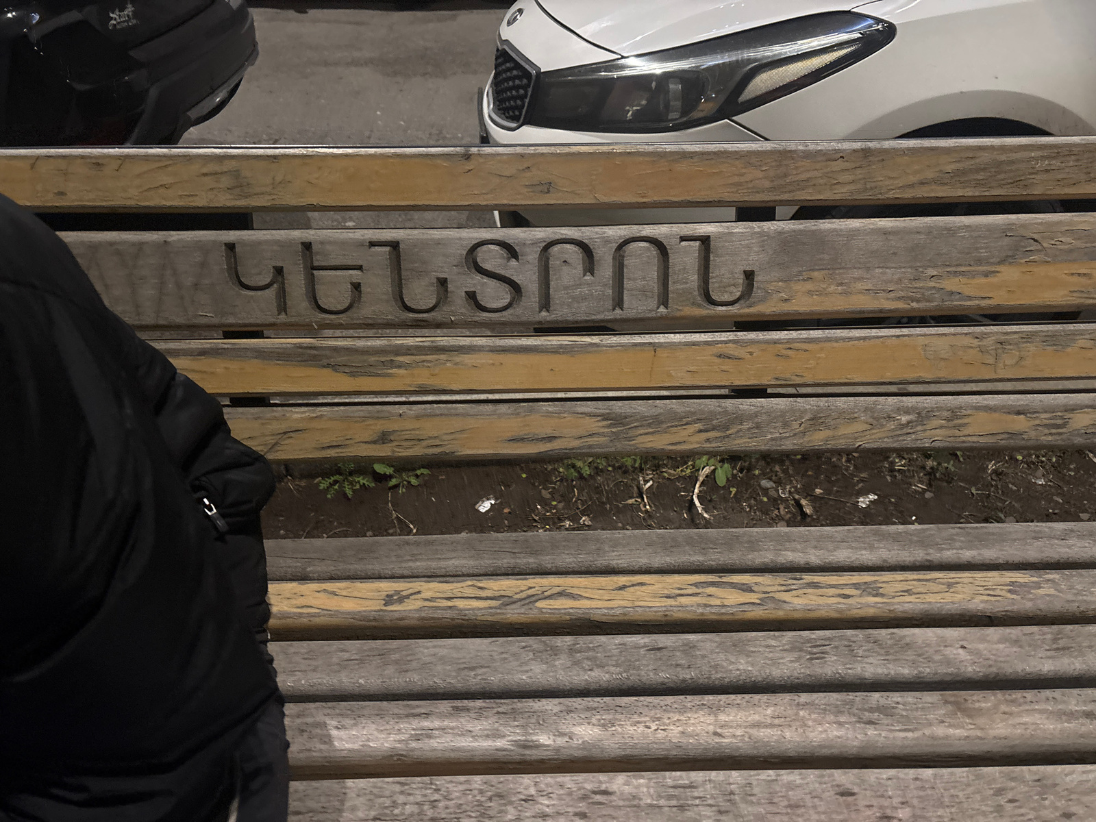 The image shows a weathered wooden bench with the word "ԿԵՆՏՐՈՆ" carved into it, which translates to "Center" in Armenian. A black jacket is visible on the left side of the bench, partially obscuring…read more