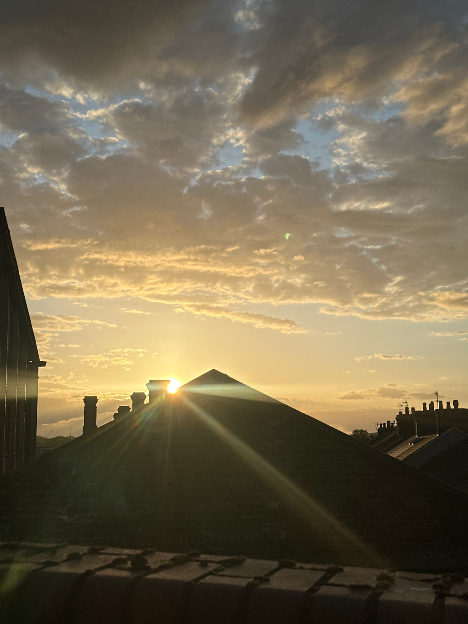 The image depicts a sky with layered, striated clouds, appearing yellowish, likely due to the setting or rising sun. In the foreground, silhouetted rooftops of buildings are visible. Sunlight is peeki…read more