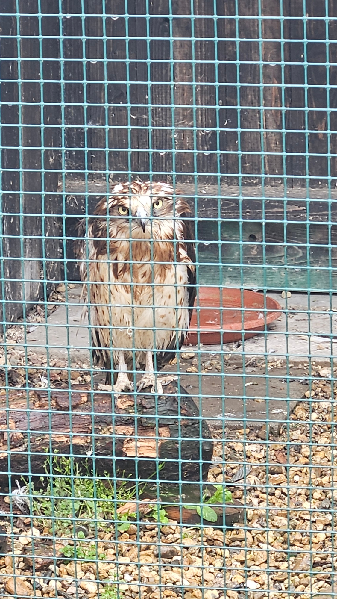 The image shows a wet owl with brown and white plumage inside a green wire cage. The owl is facing the camera with its large, yellow eyes visible. Behind the cage is a wooden structure and gravel grou…read more