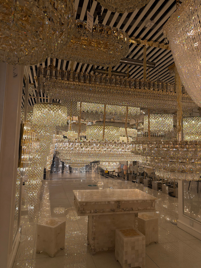 The image depicts an opulent indoor showroom, likely a luxury lighting or chandelier store, in Dubai, United Arab Emirates. The space is filled with hundreds of sparkling crystal chandeliers of varyin…read more