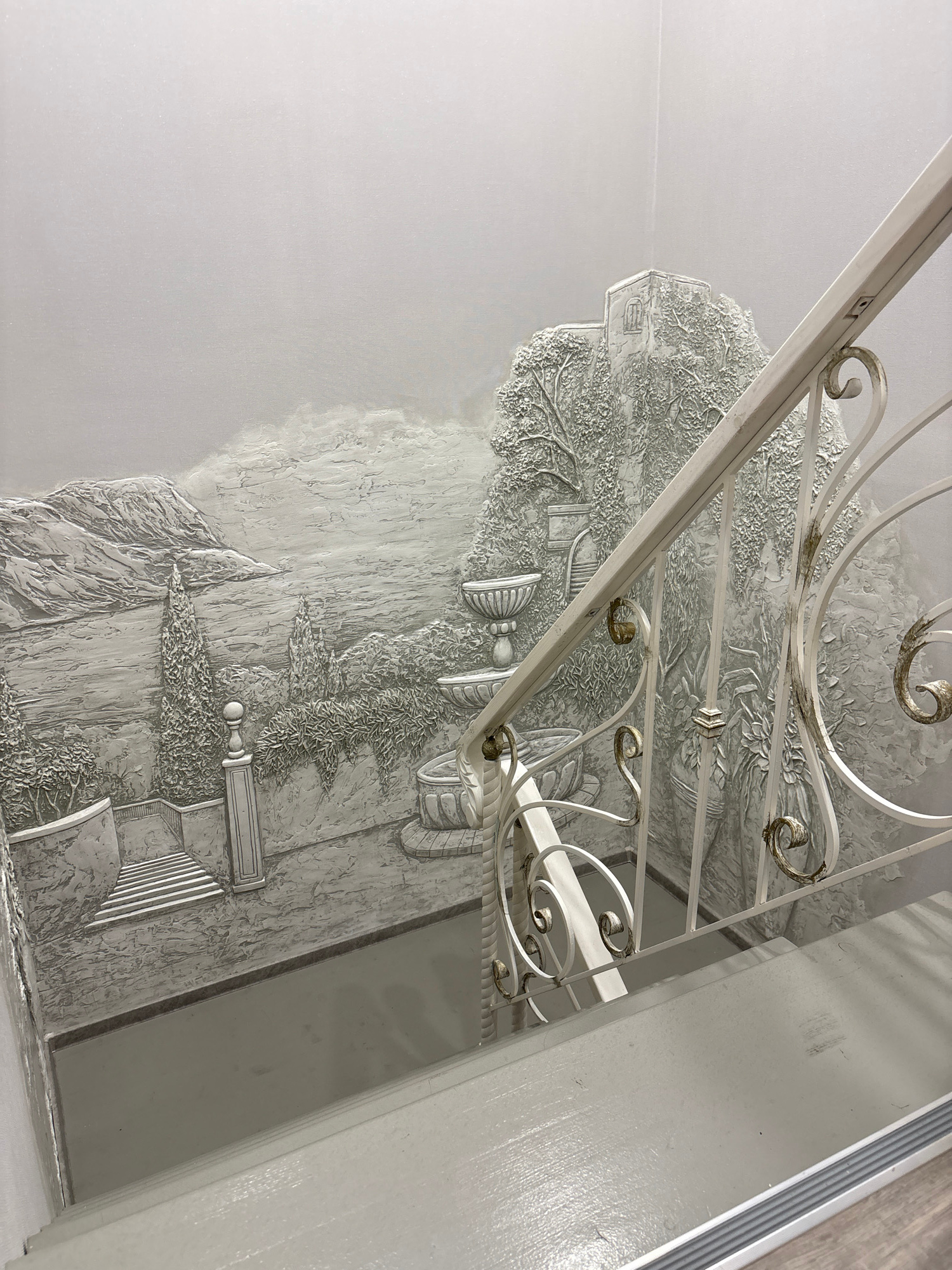 The image shows an interior space, likely a hallway or stairwell. The dominant feature is a textured wall relief depicting a landscape scene, possibly a classical or historical setting with trees, str…read more
