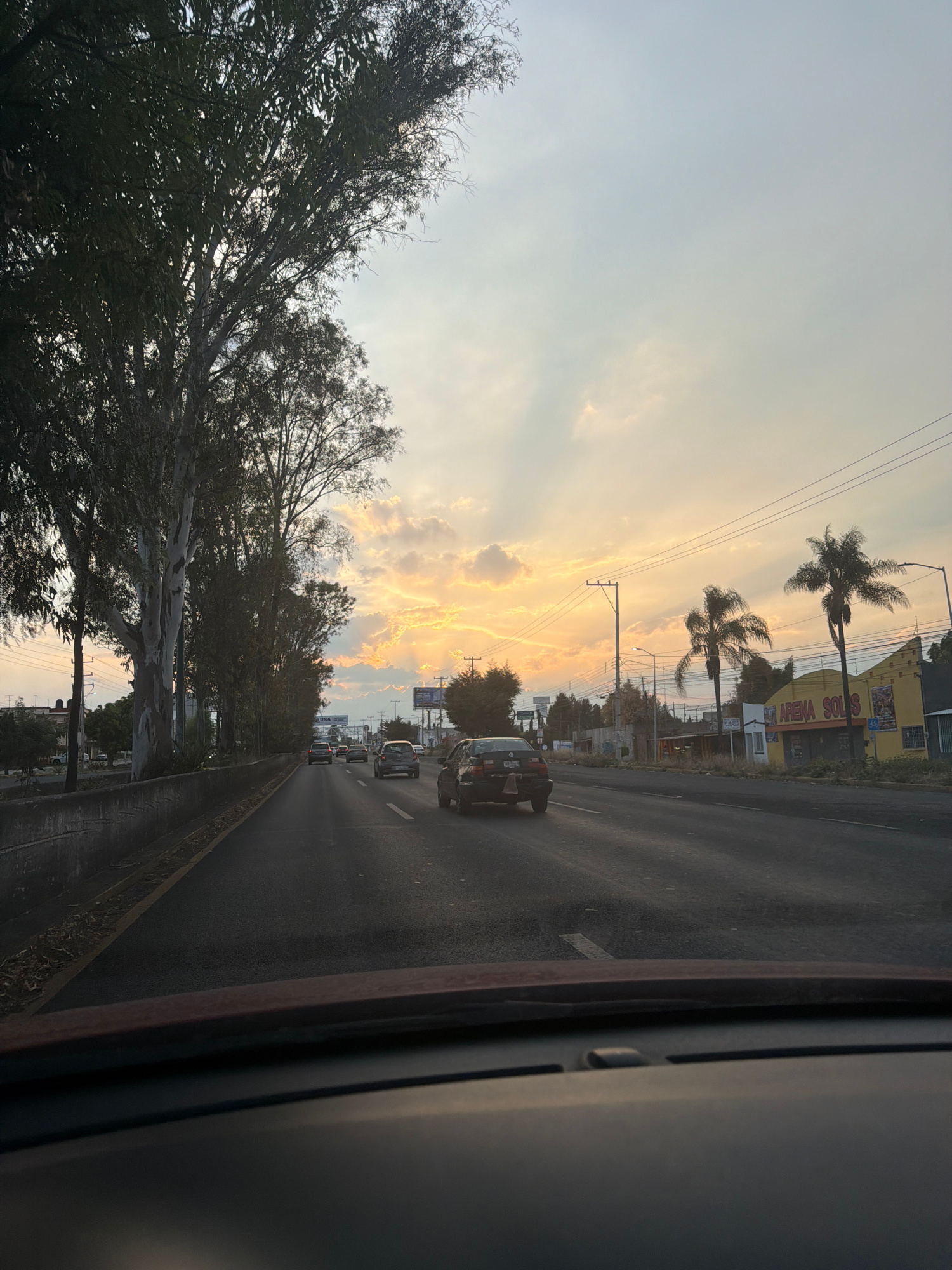 The image depicts a street scene in Puebla, Mexico, viewed from inside a moving vehicle. The view is through the windshield with the car's frame visible on the right. The street has multiple lanes of…read more
