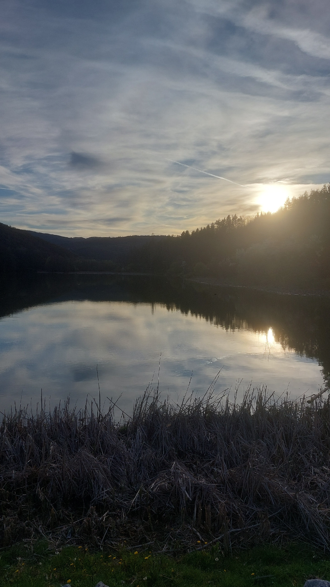 The image presents a view of a body of water reflecting the sky, land, and sun. **Location:** The location is not discernible from the image and cannot be confirmed as Gabrovo, Bulgaria without addit…read more