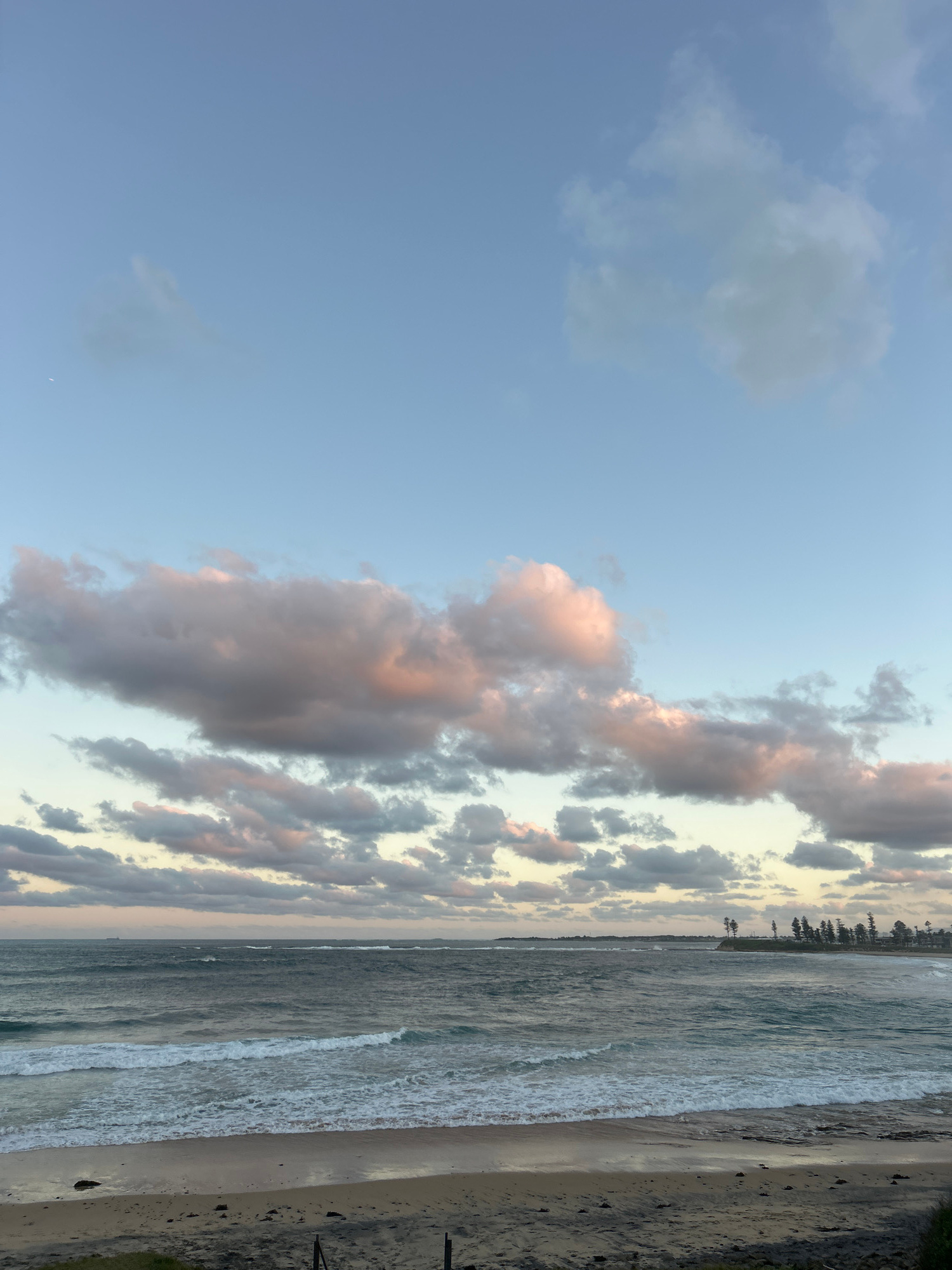 The image depicts a beach scene in Bulli, Australia, at what appears to be dusk or dawn. The sky is a pale blue with scattered clouds, some tinged with pink hues, suggesting either sunrise or sunset.…read more