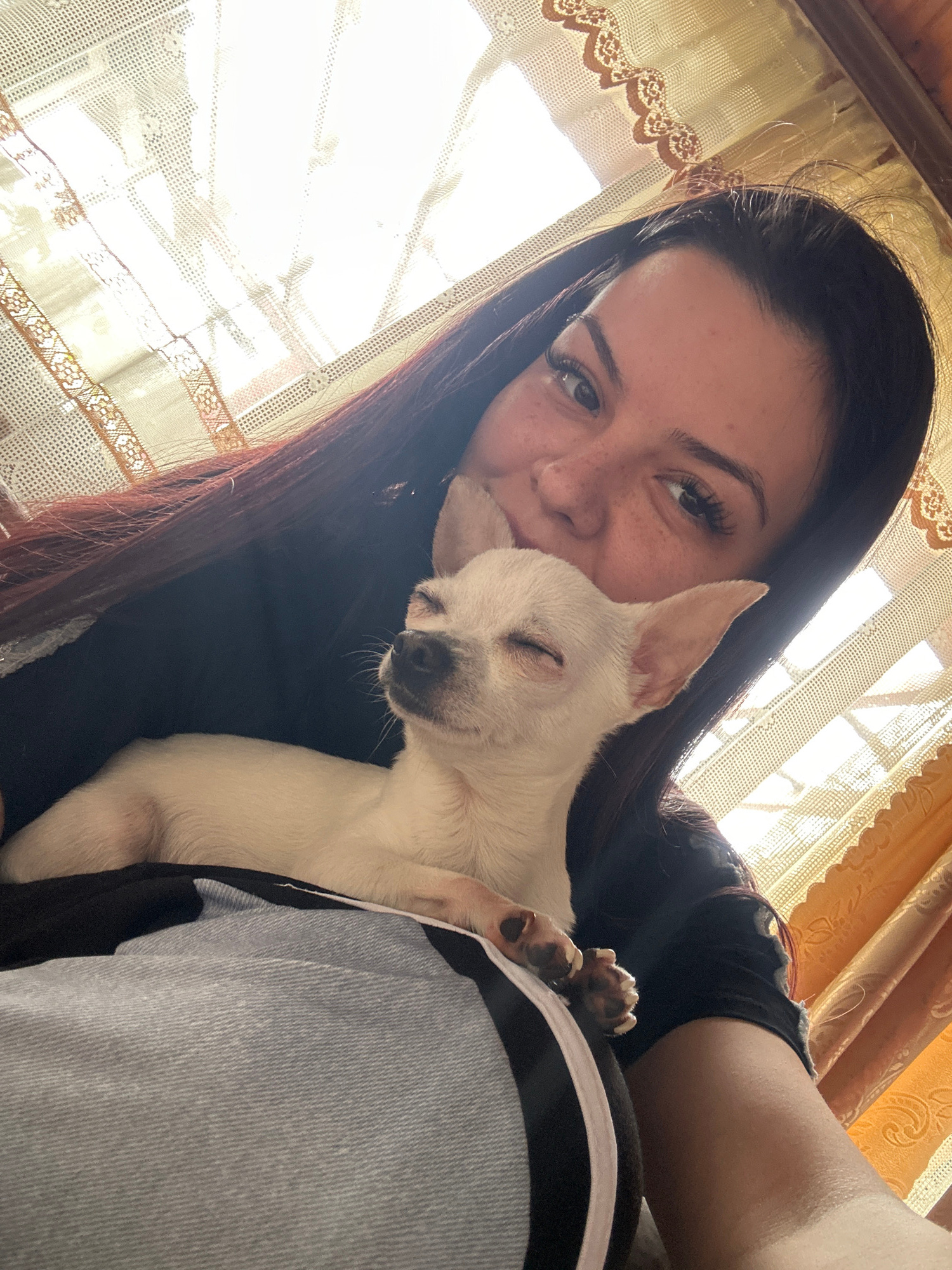 A woman with long dark hair and freckles is holding a small, sleeping white Chihuahua. The woman is wearing a black shirt and what appears to be gray pants with a black stripe. The background features…read more