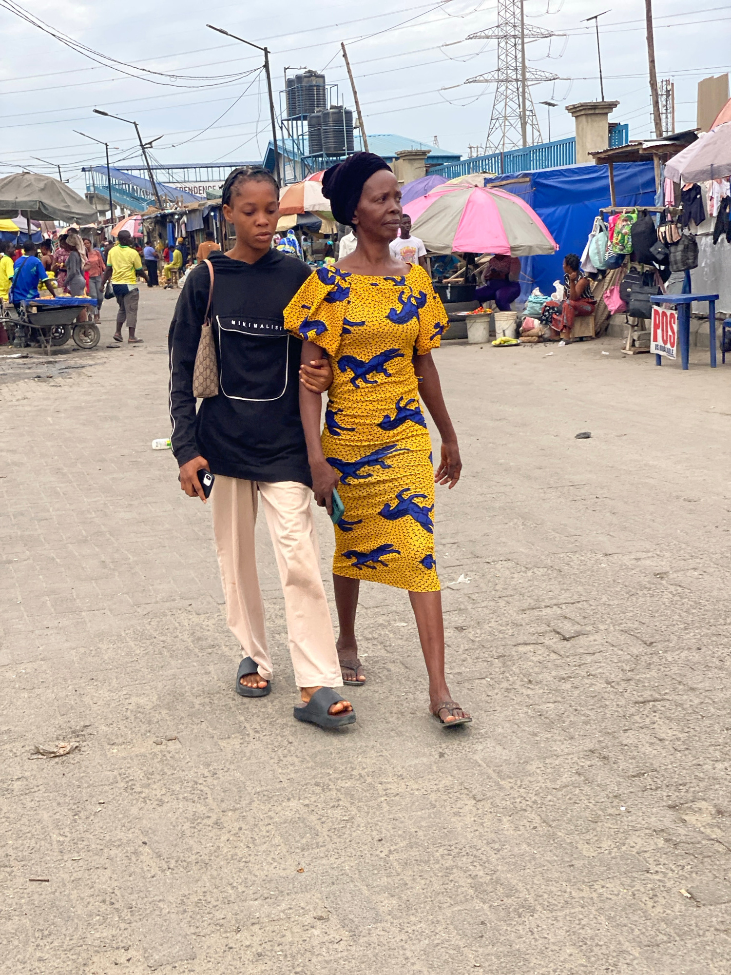 The image shows two women in a street setting, presumably in Lagos, Nigeria, given the presence of street vendors, pedestrian traffic, and an informal market environment. One woman is wearing a yello…read more