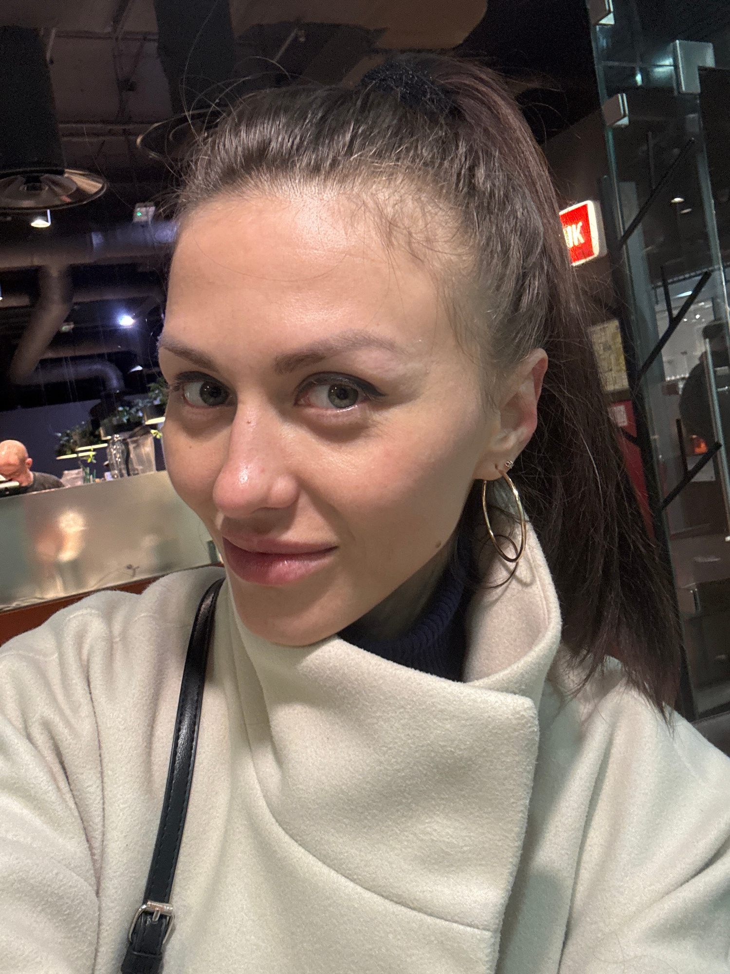 A person with brown hair tied back and wearing gold hoop earrings and a white coat stands in front of what appears to be a window, capturing a selfie. Reflections in the window show elements of a rest…read more