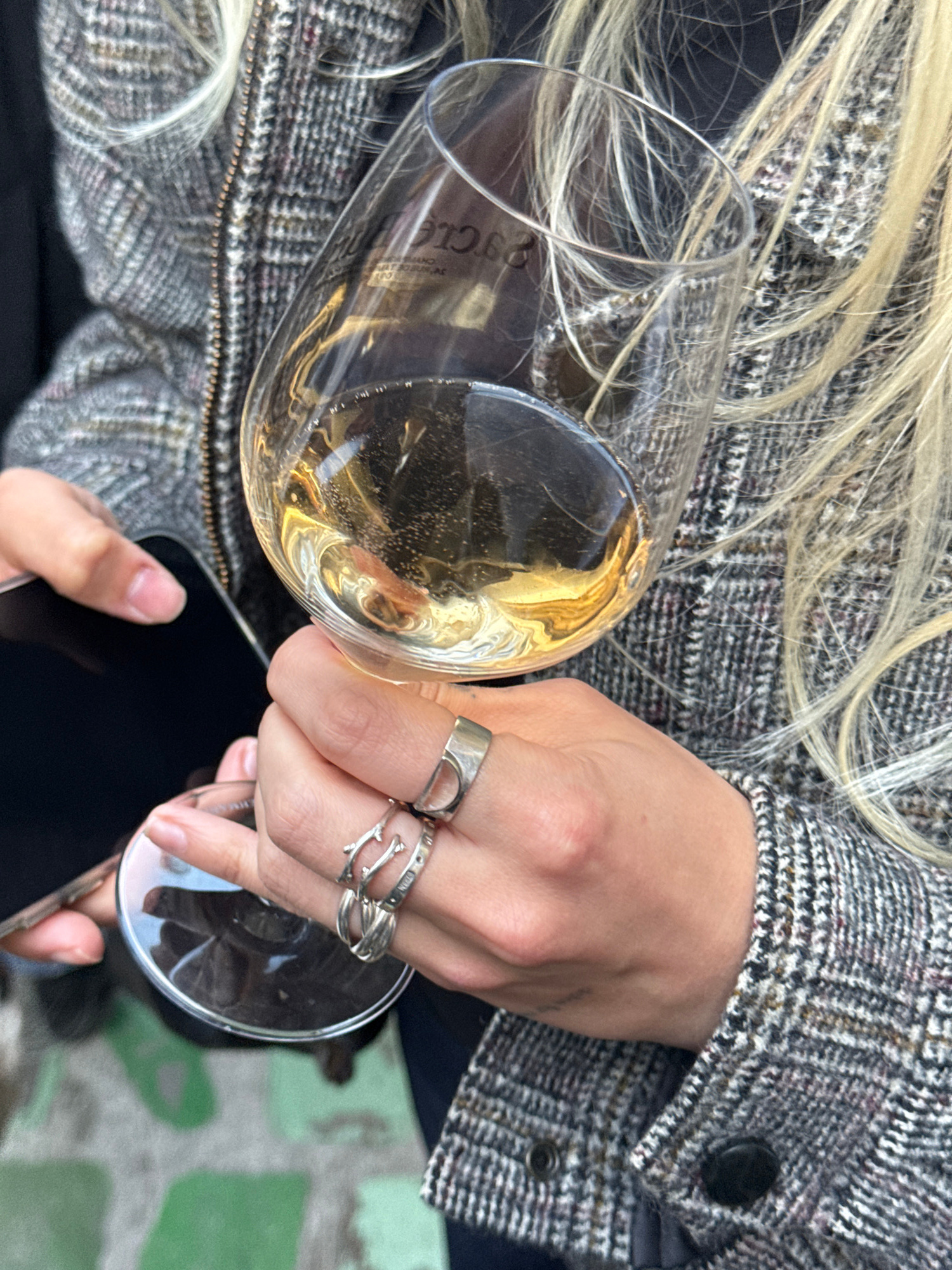 A woman with blonde hair is holding a glass of white wine in her right hand, which is adorned with three silver rings. She is wearing a grey and black houndstooth jacket. In her left hand, she is hold…read more