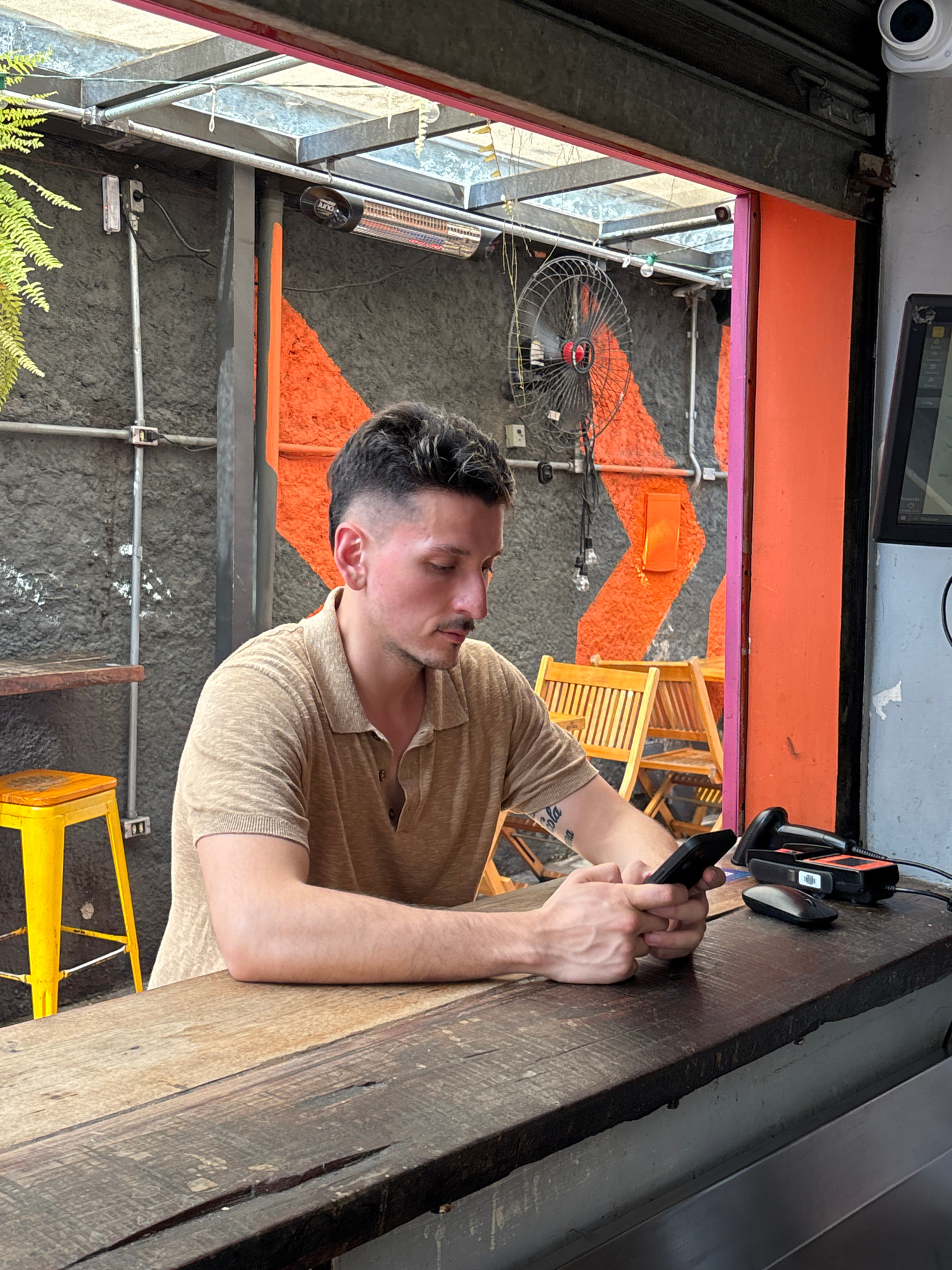 A man sits at a wooden table, using a smartphone. He wears a beige, short-sleeved polo shirt. His arms rest on the table. He has short, dark hair and fair skin. Tattoos are visible on his left forearm…read more