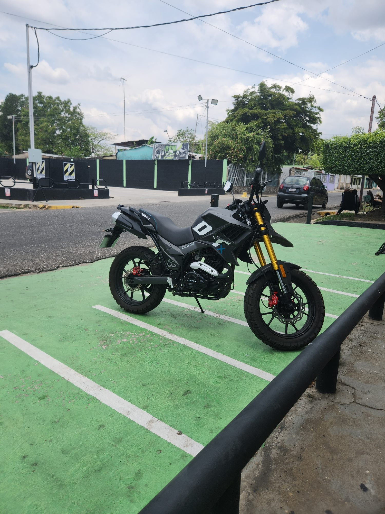 A black and gray motorcycle is parked on a green and white painted parking surface, situated next to a curb and a row of black metal barriers. A street with vehicular traffic is visible in the backgro…read more