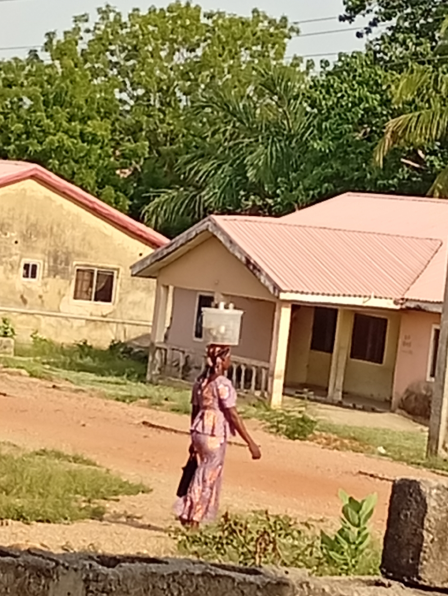 The image depicts a bright daylight scene in a residential area of Adankolo, Nigeria. A woman is prominently featured walking away from the viewer along a reddish-brown dirt path. She wears a patterne…read more