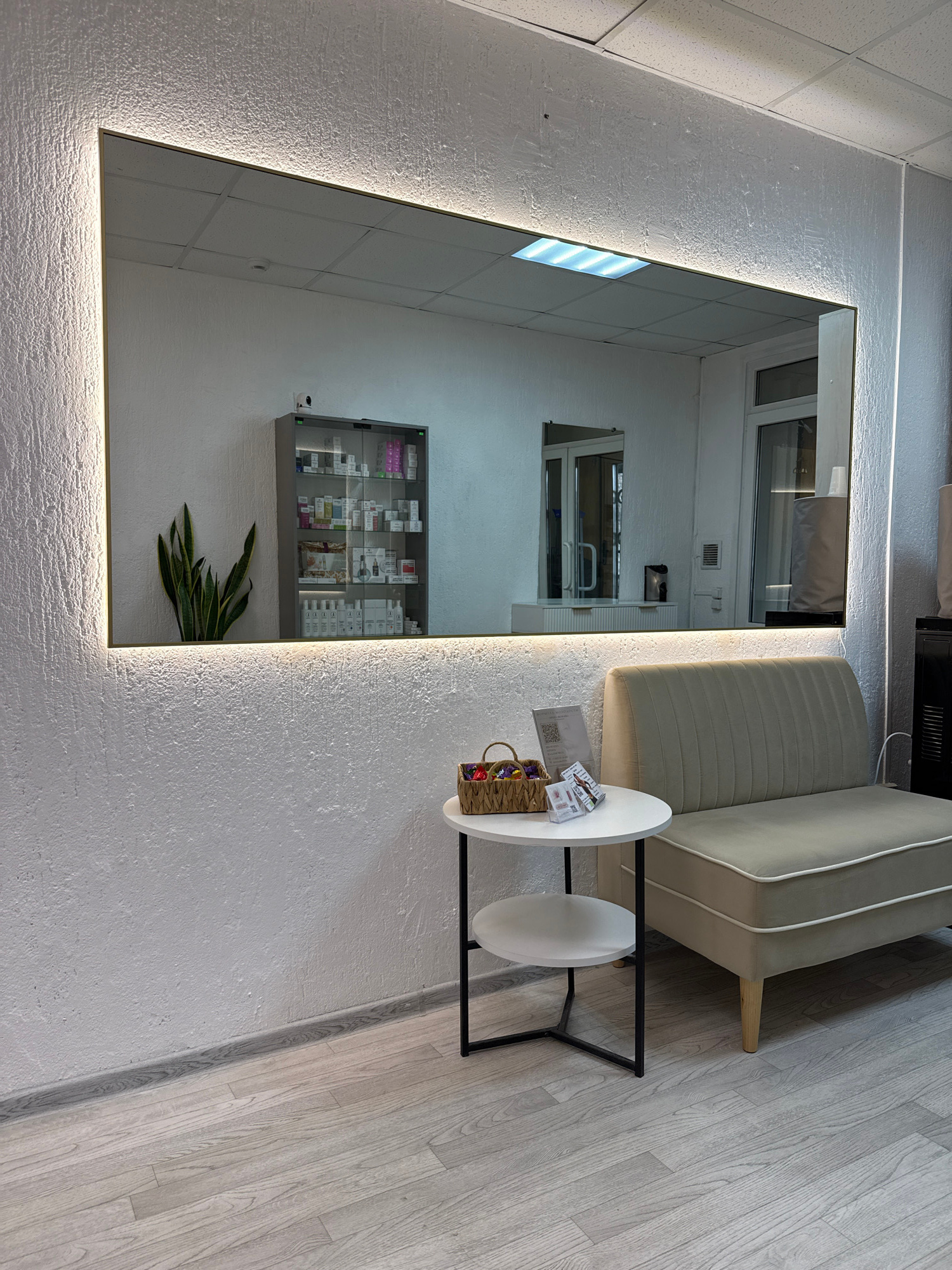 This media file captures an interior scene, likely a waiting area in a commercial establishment such as a salon, clinic, or aesthetic center in Chaikovsky, Russia. No people are visible, and no specif…read more