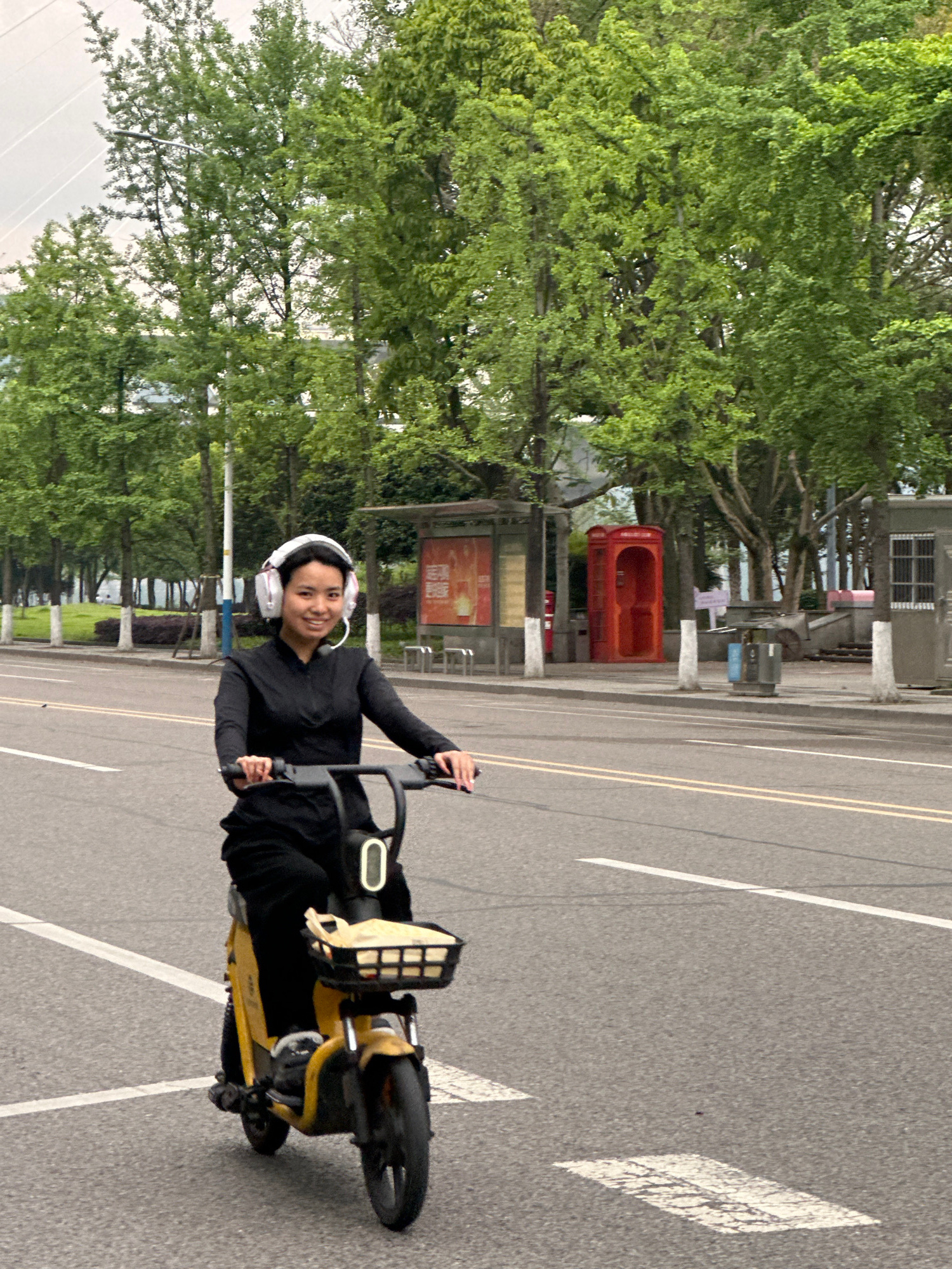The image, oriented correctly, captures a person on an electric scooter on a paved road during daytime. The primary subject is a young person, likely female, with dark hair, wearing a black long-sleev…read more