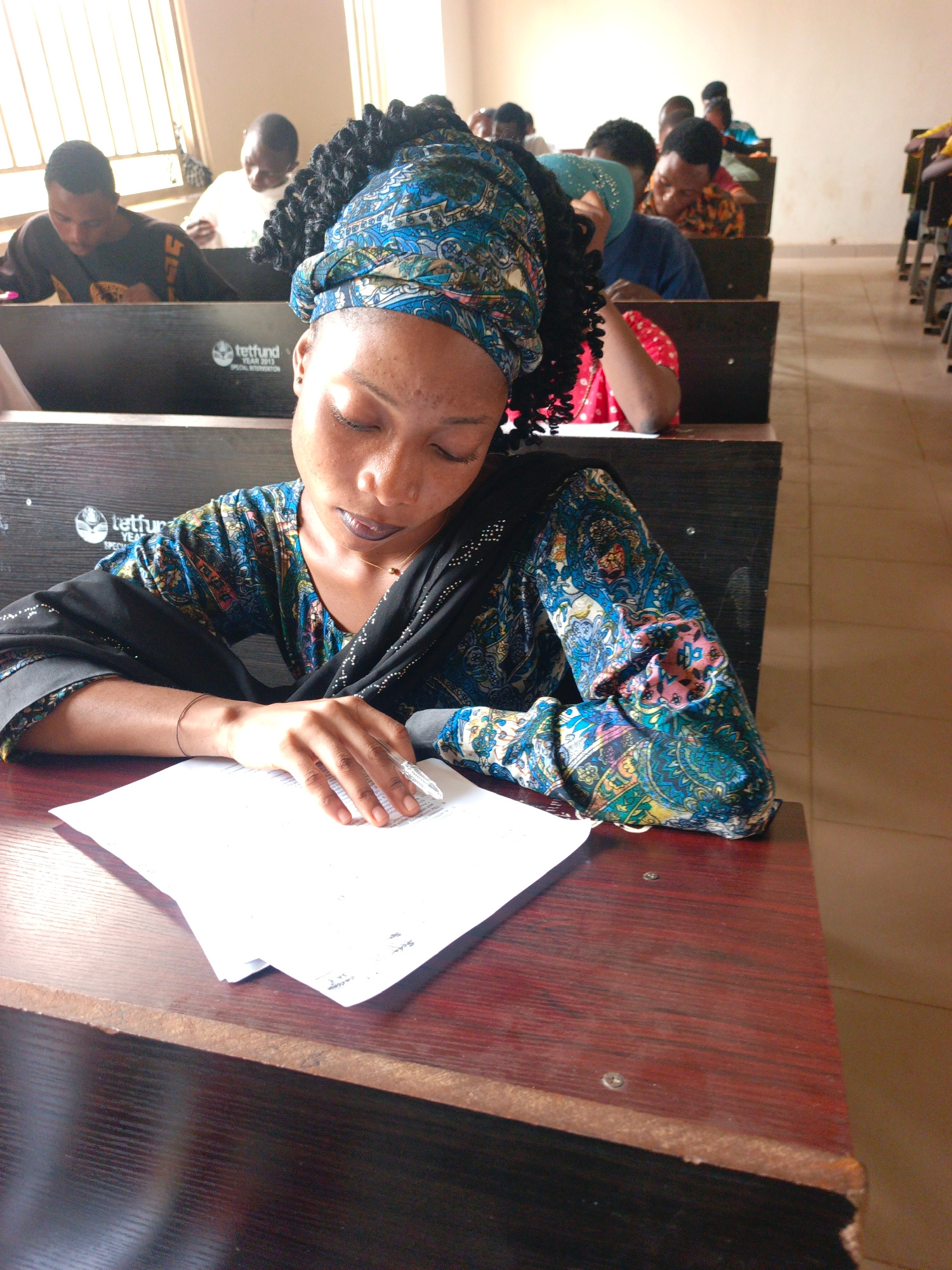 The image depicts a woman in a classroom setting in Akwanga, Nigeria. She is seated at a wooden desk with papers in front of her, apparently reading or writing. She wears a colorful, patterned top and…read more