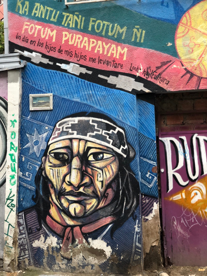 A vibrant mural showcases indigenous themes. On the left, broad stripes of turquoise, white, and pink display text reading "KA ANTU TANI FOTUM NI" and "FOTUM PURAPAYAM," translated as "Un día en los h…read more