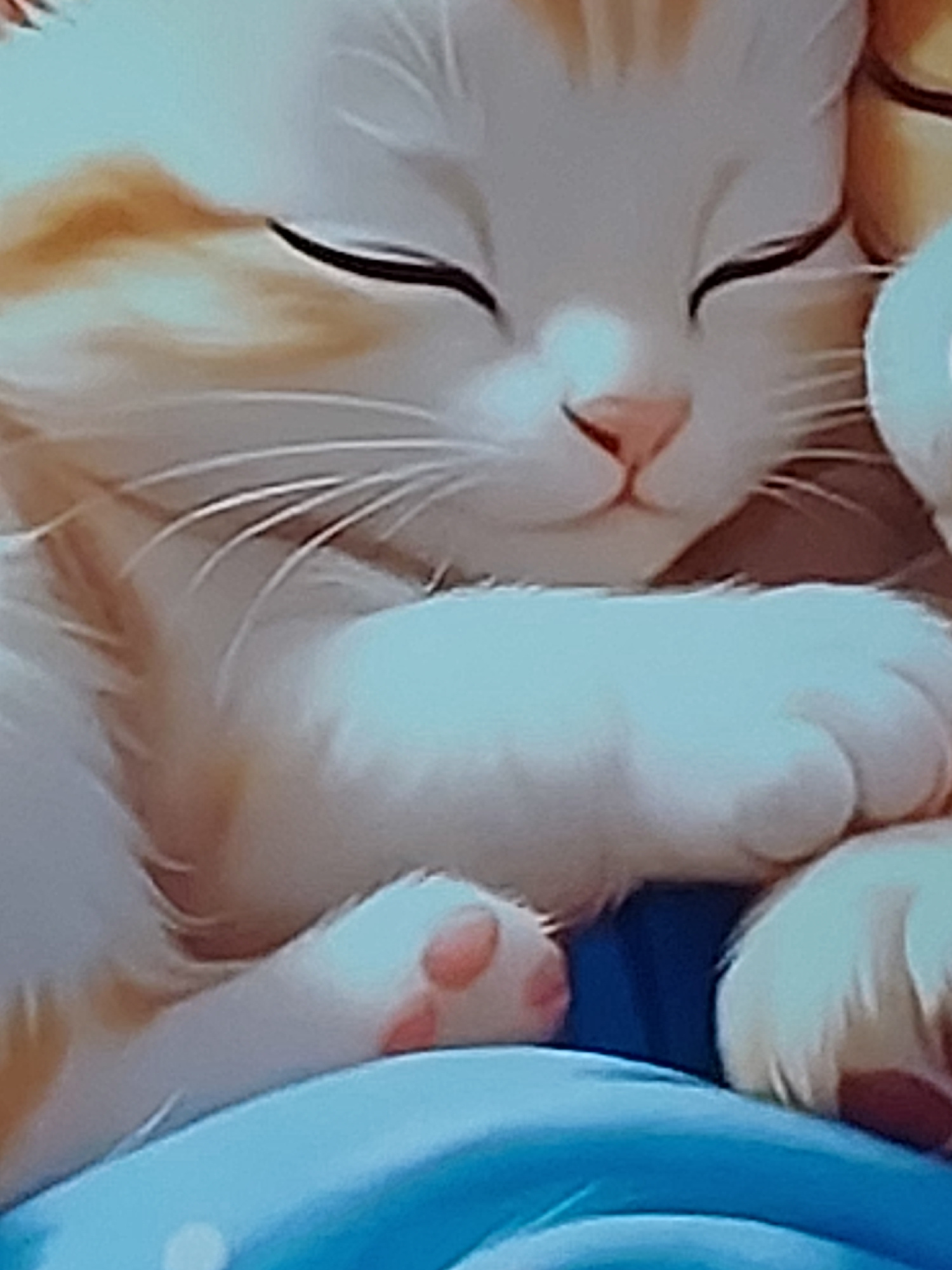 A sleeping cat is the central subject of the image. The cat is light orange and white with its eyes closed. Its front paw is raised near its head, showing pink toe beans. A blue object is partially vi…read more