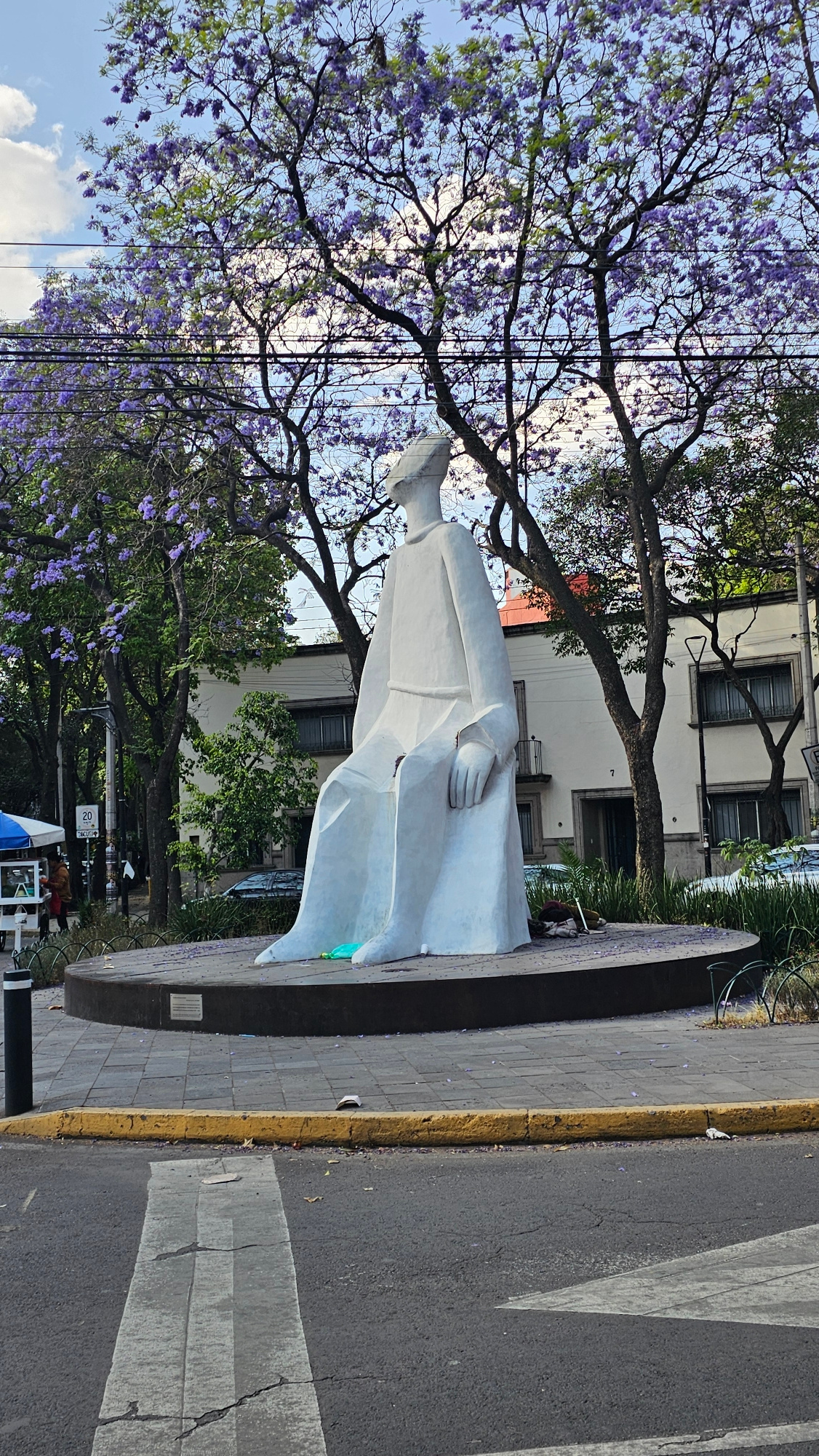 The image shows a white statue of a seated man in Mexico City, Mexico. The statue is positioned on a stone plinth, beside a sidewalk and road, near blooming jacaranda trees with purple flowers. A mult…read more