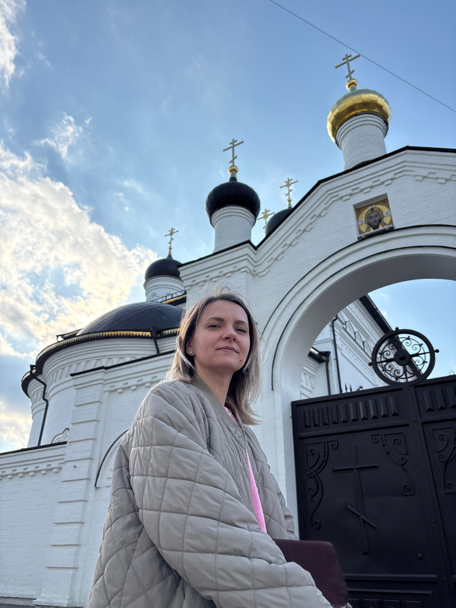 A woman stands in front of the Holy Resurrection-Nefedovsky Monastery in Ulyanovsk, Russia. The monastery features white walls, black domed roofs, and golden crosses. The sky above is blue with scatteβ¦read more