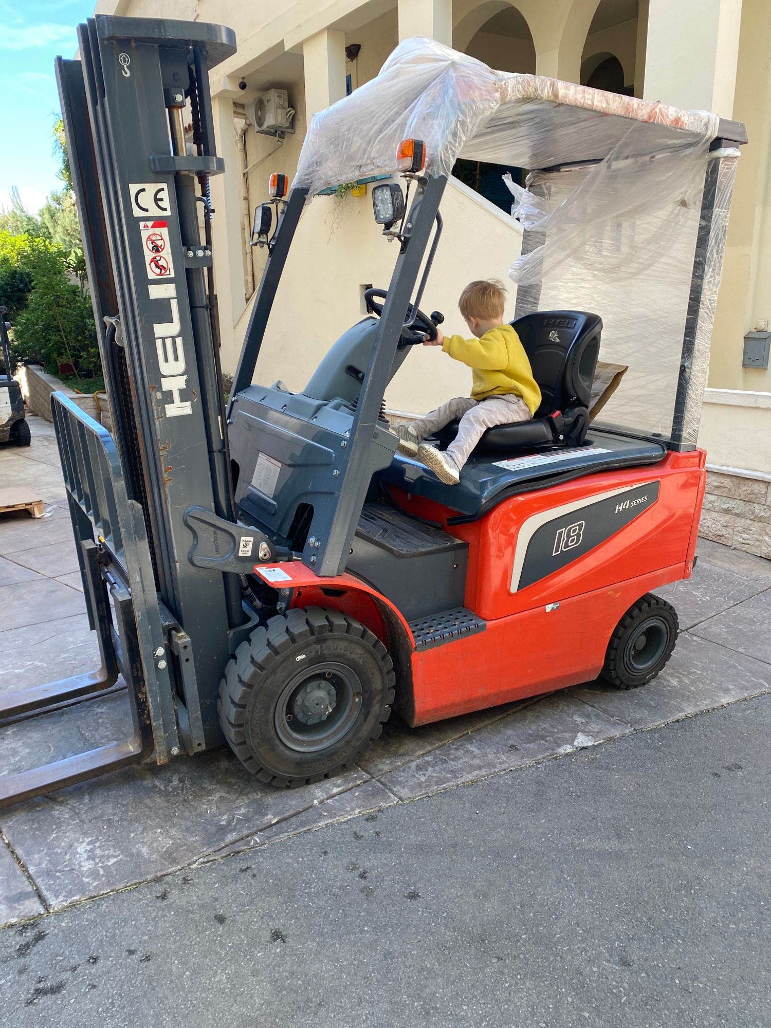 A child in a yellow shirt and light-colored pants is climbing onto a red and gray forklift. The forklift is parked on a paved surface next to a building. A covered object is attached to the top of the…read more