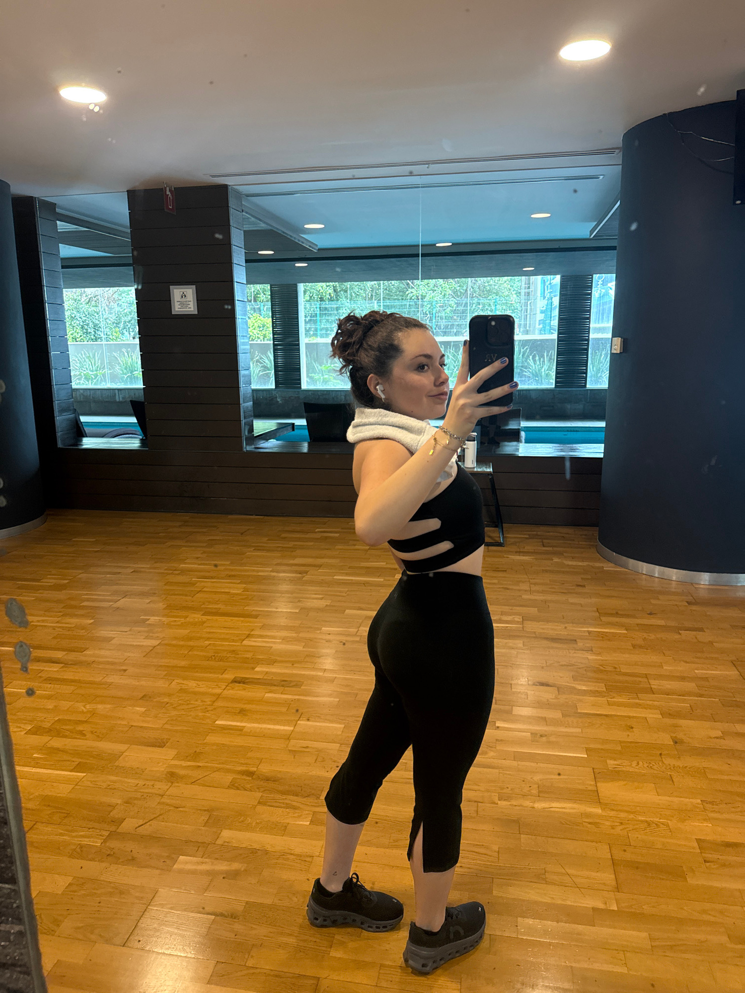 A woman is standing in what appears to be a gym. She is holding a black smartphone, presumably taking a selfie in the mirror. She is wearing black workout clothes and grey athletic shoes. She has a toβ¦read more