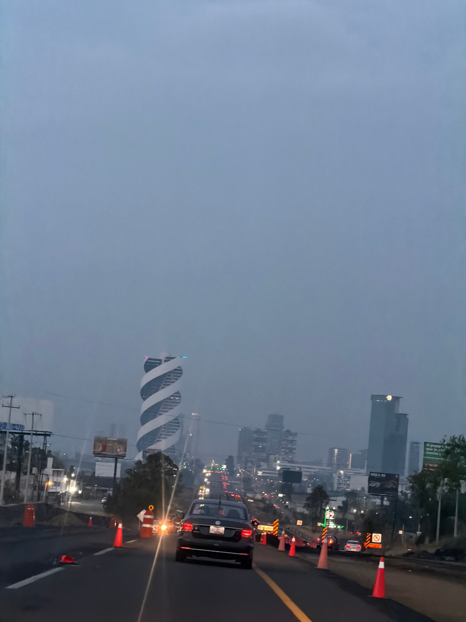 The image shows a highway scene in San Andrés Cholula, Mexico, on a hazy or overcast day. The view is captured from a vehicle on the road. The traffic appears congested. Orange traffic cones line the…read more