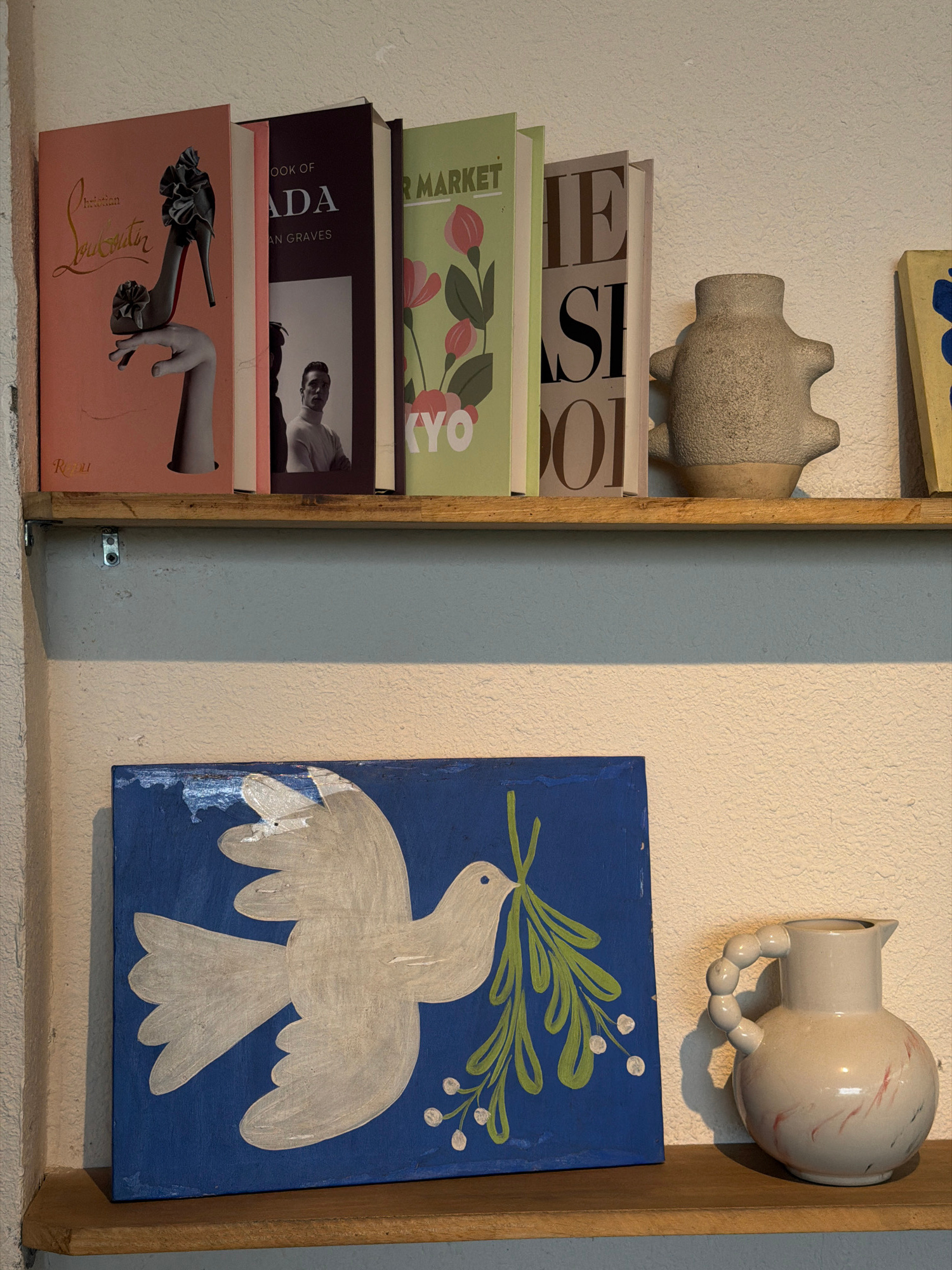This indoor scene features a curated display of objects and books against a textured, light-colored wall. On the left, a stack of books is neatly arranged within a light wooden frame. The top partiall…read more