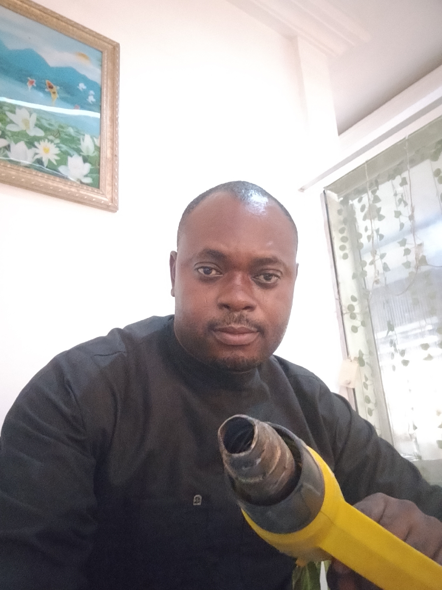 A medium indoor shot shows a man holding a yellow heat gun, likely in a residential location in Gwarinpa, Nigeria. The man has a shaved head, dark complexion, and is wearing a dark-colored shirt. He fâŚread more