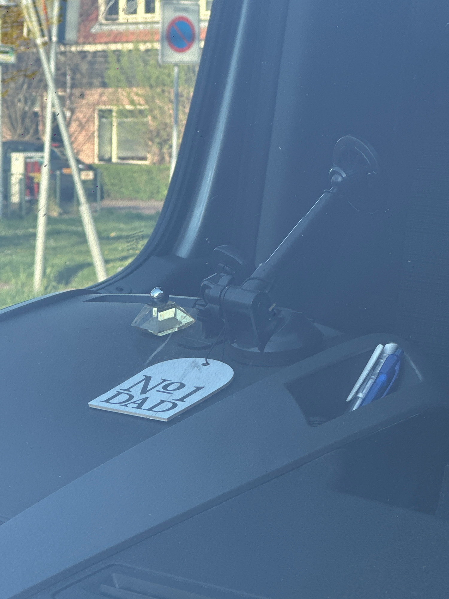 The image is taken from inside a car, looking out through the windshield. A "No. 1 Dad" tag hangs from the rearview mirror, along with a crystal. A mobile phone holder is mounted on the windshield. Thβ¦read more