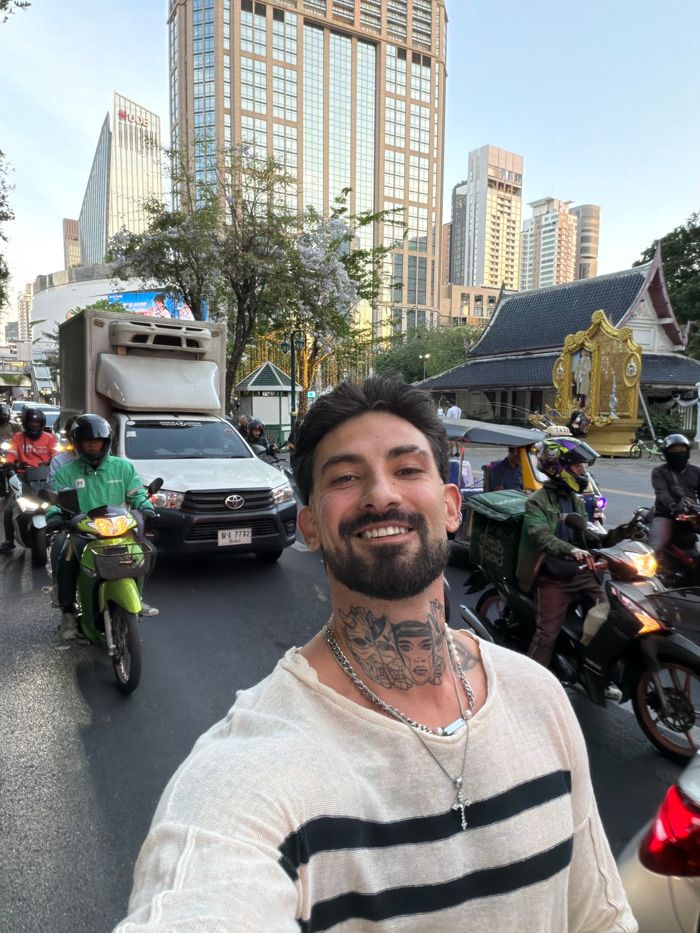 The image captures a bustling street scene in Bangkok, Thailand, specifically near the Ratchaprasong intersection, with the Erawan Shrine prominently visible on the right. In the foreground, a male i…read more