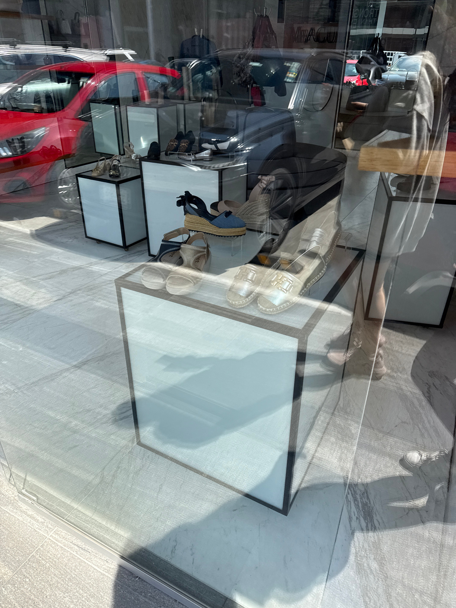 The image displays a clear daytime view through a reflective glass storefront of a retail space, identified as being located in Puebla, Mexico. Inside the store, an array of women's footwear is prese…read more