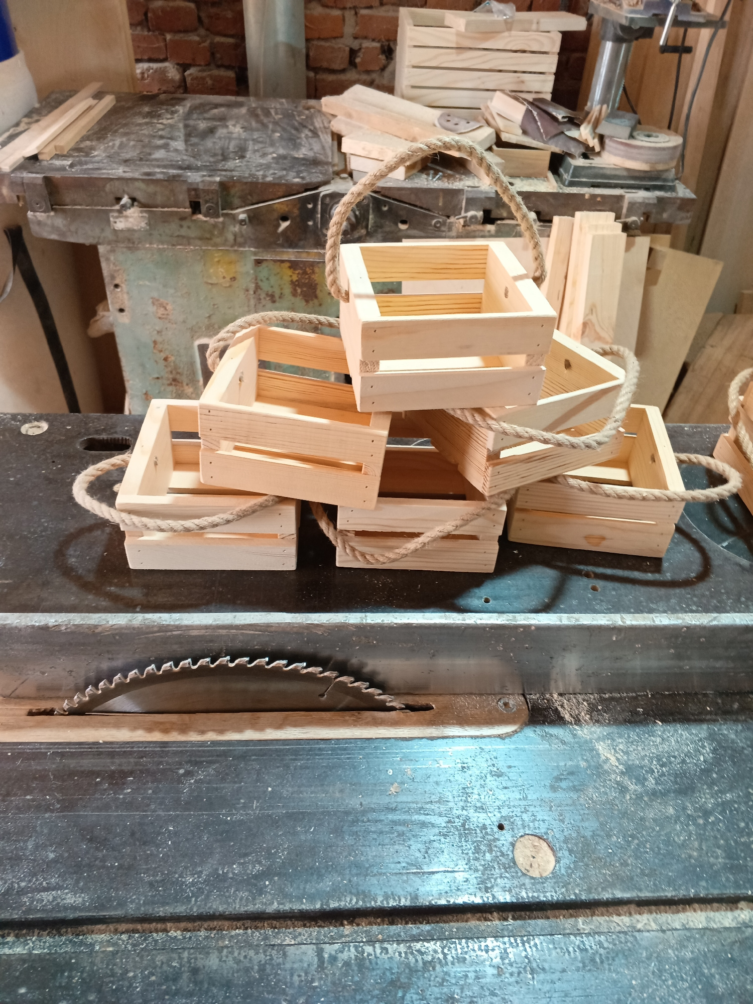 The image depicts a workshop environment, likely in Chaikovsky, Russia, though this is not directly verifiable from the image. A stack of small, light-colored wooden crates with rope handles sits prec…read more