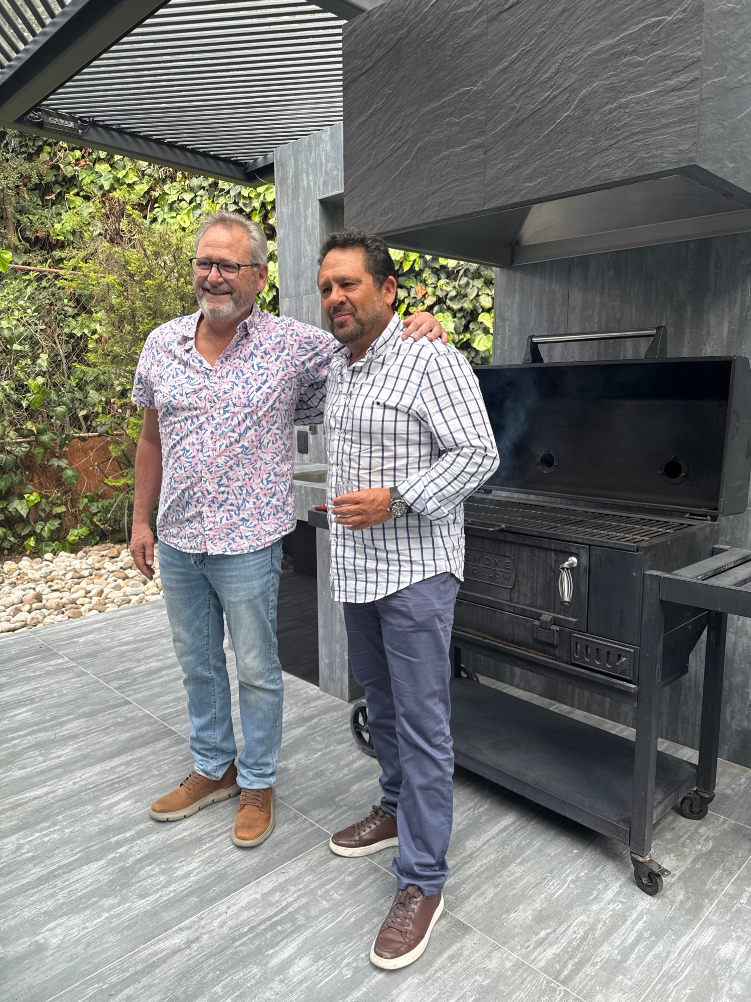 Two men are captured in an outdoor setting, standing next to a large black barbecue grill or smoker. The image shows a relaxed, daytime gathering. The man on the left, appearing older, wears glasses…read more